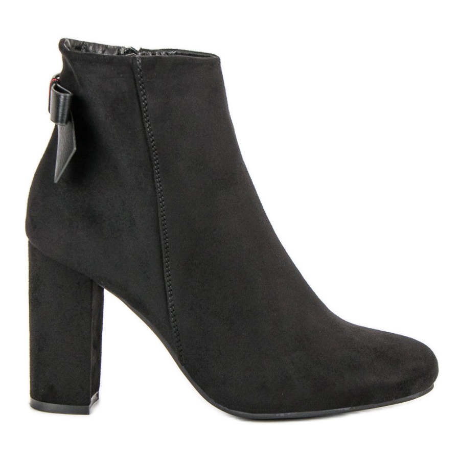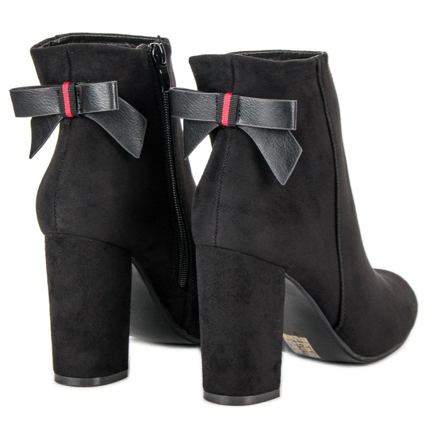 Un talon haut de 9,5 cm d'épaisseur en forme de bloc offre stabilité et confort de port tout au long de la journée. Un avantage supplémentaire est le nœud qui décore les chaussures, qui leur donne un accent subtil et féminin. Les bottines noires ont un bout rond, ce qui les rend confortables et adaptées à un port prolongé.