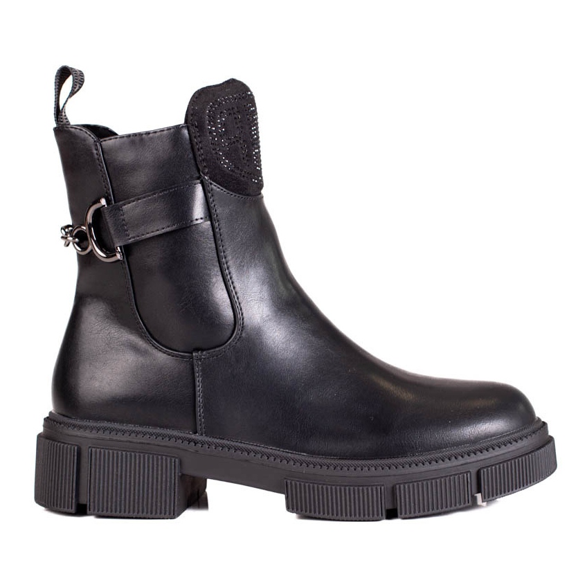 Des bottes féminines élégantes et noires sur une plate-forme légère, parfaite pour la saison automne / hiver. Fabriqué en cuir écologique, avec un insert de fourrure isolé et une doublure textile, combinez le design à la mode et décontracté avec des fonctionnalités quotidiennes. Des décorations délicates sous la forme de zircons et d'une chaîne ajoutent un caractère, sans abandonner l'universalité.