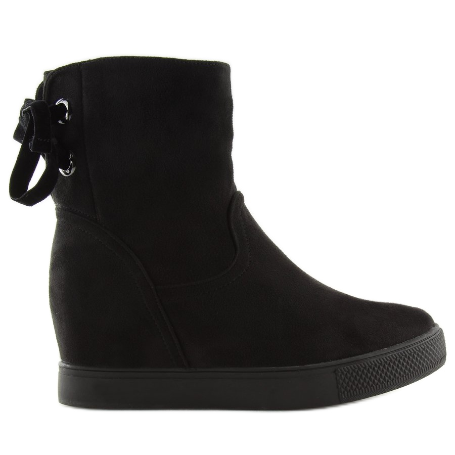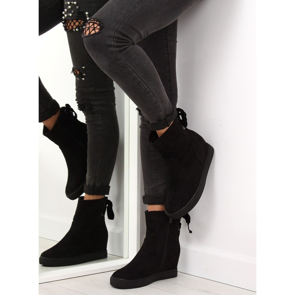 Noir HQ886 Les bottines compensées noires cachées sont un élément essentiel de la garde-robe de chaque femme, surtout à l'automne. Ces bottines élégantes se distinguent par une tige haute et un laçage décoratif, qui leur confèrent un caractère unique. Fabriqués en daim écologique, ils offrent non seulement un look élégant, mais aussi un confort de port grâce à la doublure en mousse.