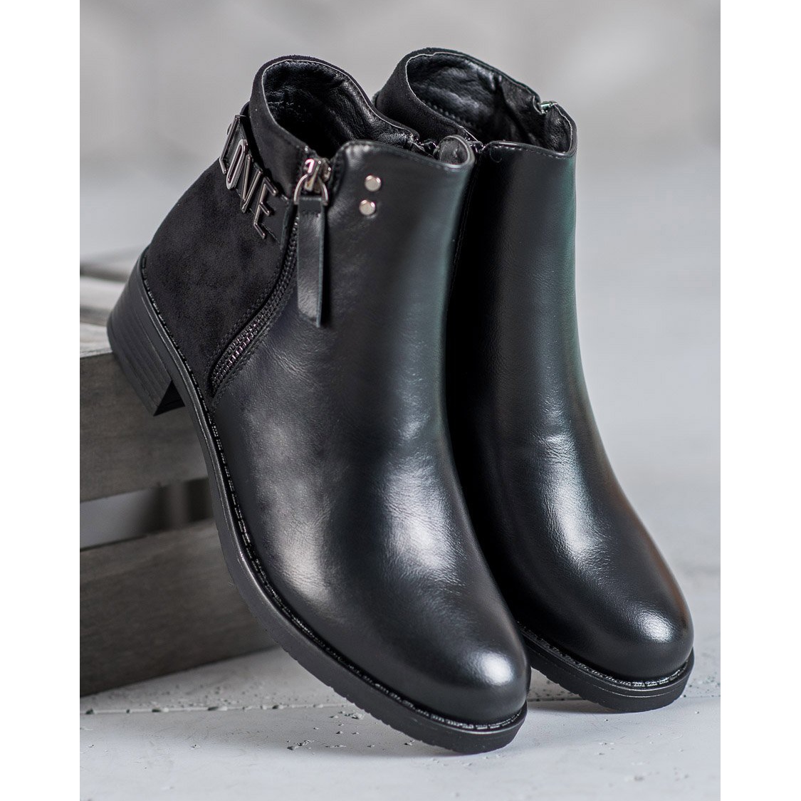 La fermeture éclair des deux côtés des chaussures garantit un enfilage facile, tandis que la fermeture éclair décorative et l'inscription LOVE ajoutent une touche unique et tendance. Le bout rond et le talon renforcé assurent un confort de port, et la hauteur du talon de 4 centimètres vous permet de profiter d'un confort tout au long de la journée.