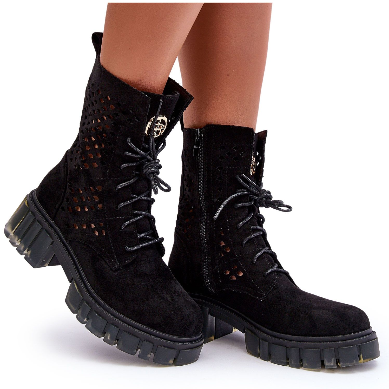 Élégant et en même temps brut dans des bottes de travail en forme de travail en forme en éco-partie noire est une proposition idéale pour les femmes qui apprécient la mode et le réconfort. La supérieure décorée d'un motif de travail ouvert délicat, fixé avec une serrure pratique et en outre pour un meilleur ajustement. Le talon et la décoration raidis sur la langue mettent l'accent sur le caractère de la chaussure, et le poteau massif de 5,5 cm de haut avec une plate-forme de 3 cm assurent la stabilité et l'isolation d'un terrain froid.