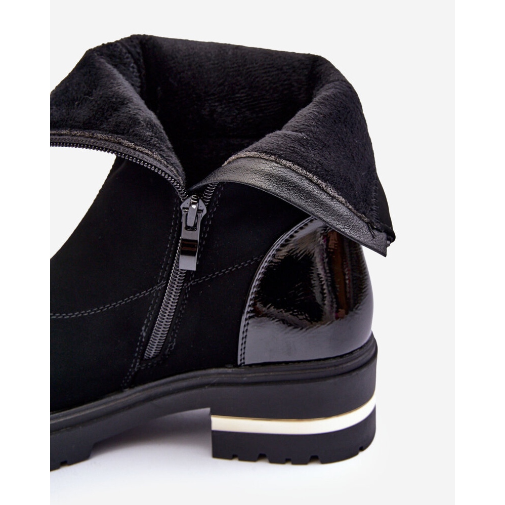 Il s'agit de bottes pour femmes de PS1, qui se distinguent par un design classique. Les bottes ont un talon plat, ce qui les rend confortables à porter. Ils sont fabriqués en cuir écologique et leur intérieur est isolé avec un couvre-chaussures. Il y a une décoration miroir sur le talon et les bottes sont fixées sur le côté de la tige avec une fermeture éclair.
