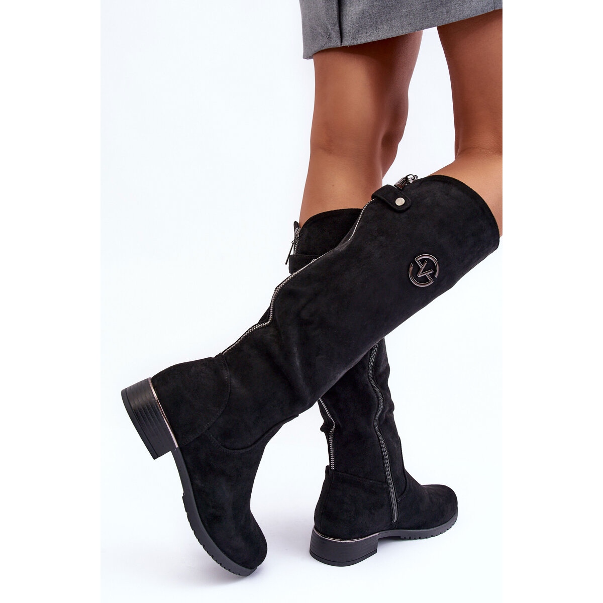 Vinceza Suede Women's Flat Boots Black Albuna sont d'élégantes bottes noires qui arrivent jusqu'au genou. Elles sont confectionnées en cuir suédé écologique de couleur noire et possèdent un talon plat. Un élément attrayant sont deux fermetures éclair - la principale sur le côté de la chaussure et la seconde à l'arrière de la tige. Ils se distinguent par un nez arrondi, ce qui les rend universels.