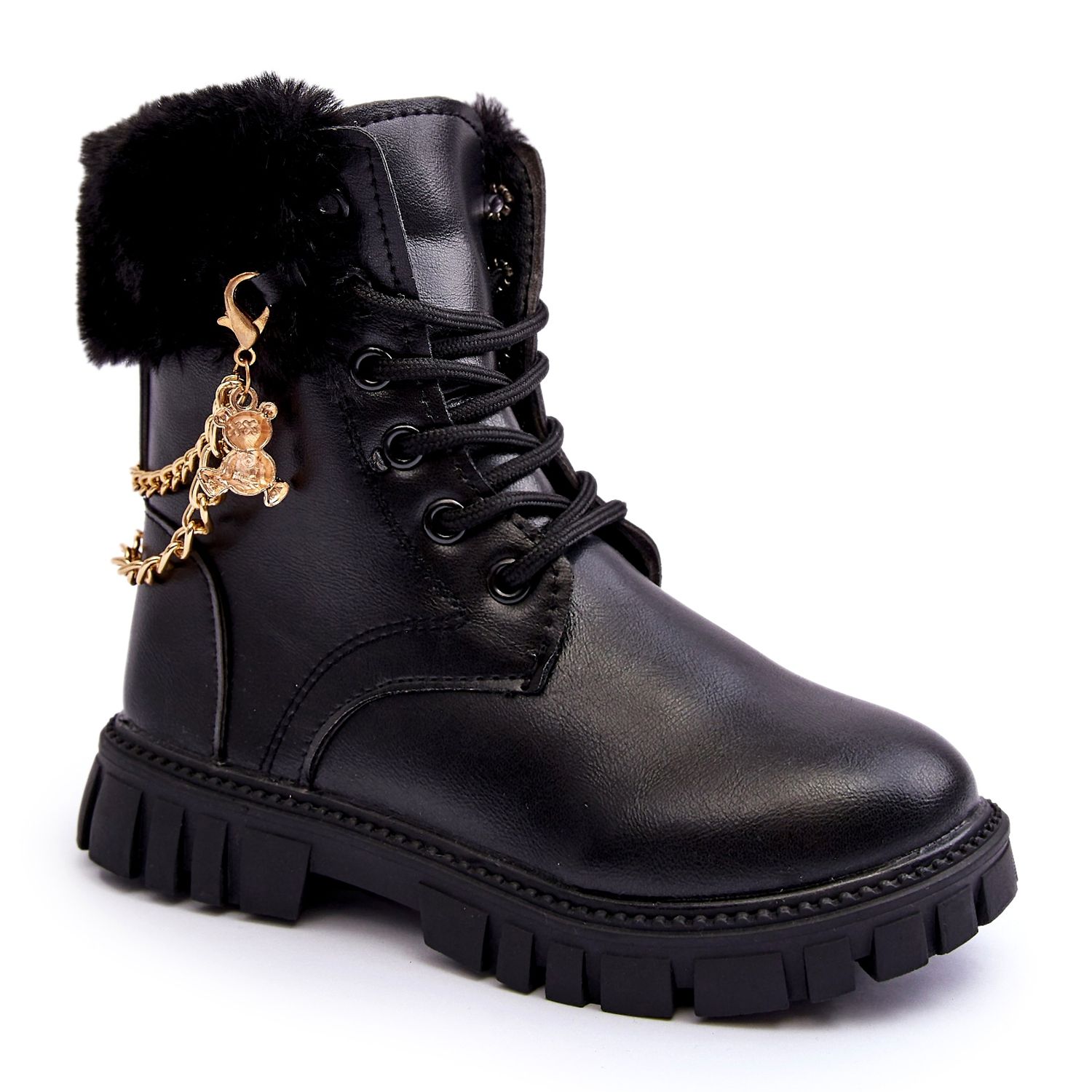 Des bottes élégantes et filles en cuir écologique de haute qualité, qui combinent un look à la mode avec les fonctionnalités. Décorée d'une chaîne spectaculaire et d'une fourrure douce sur le dessus, ils sont parfaits en complément des stylisations hivernales et automnales d'un petit amant de mode.