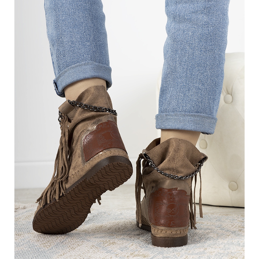Nous vous présentons les bottines Maral beiges pour femmes, qui allient parfaitement le style bohème et le confort au quotidien. Fabriquées en cuir suédé écologique de haute qualité, ces bottines séduisent par leur légèreté et leur élégance. Ornés d'une chaîne métallique et de franges tendance, ils complèteront parfaitement n'importe quel style automne-hiver en lui ajoutant un caractère raffiné.