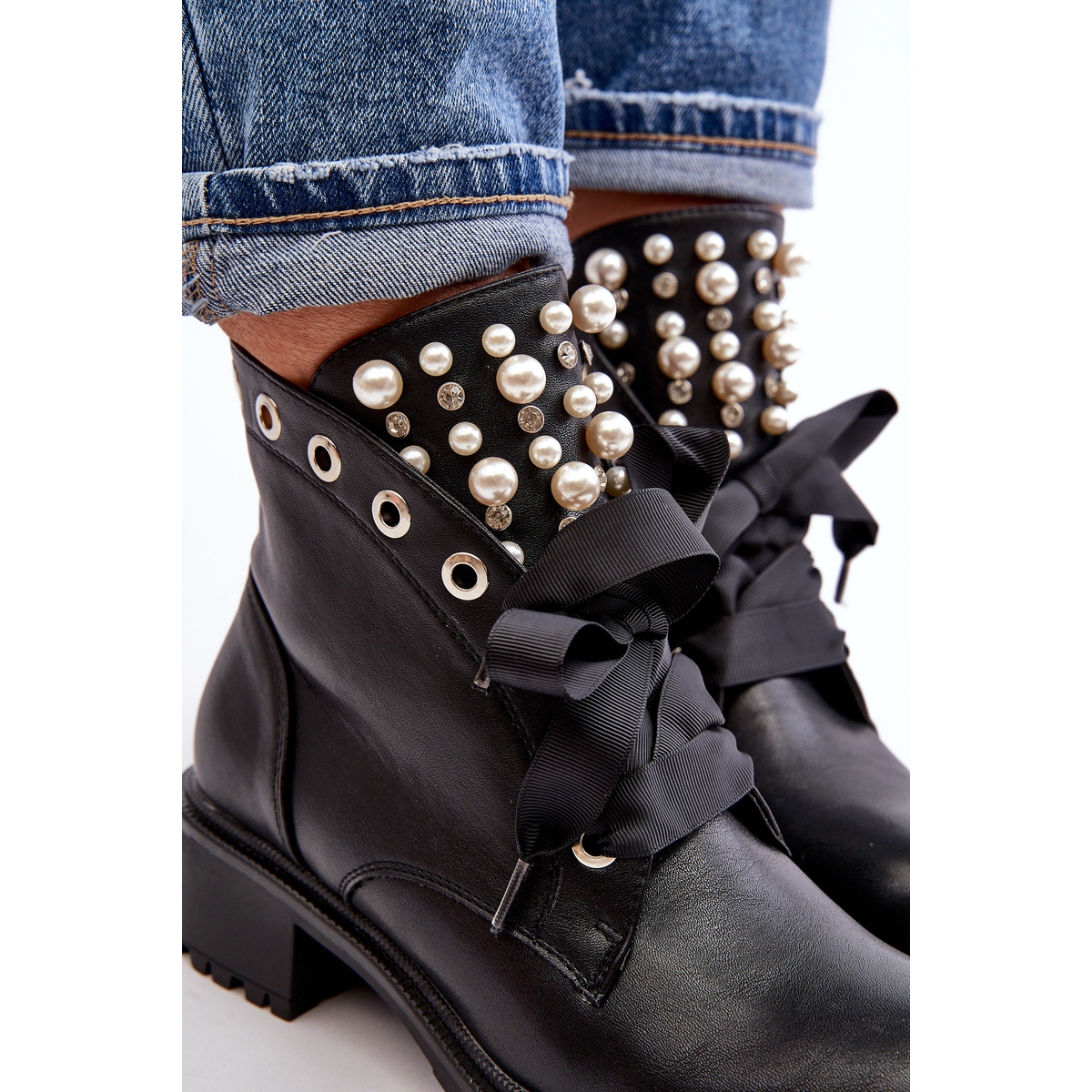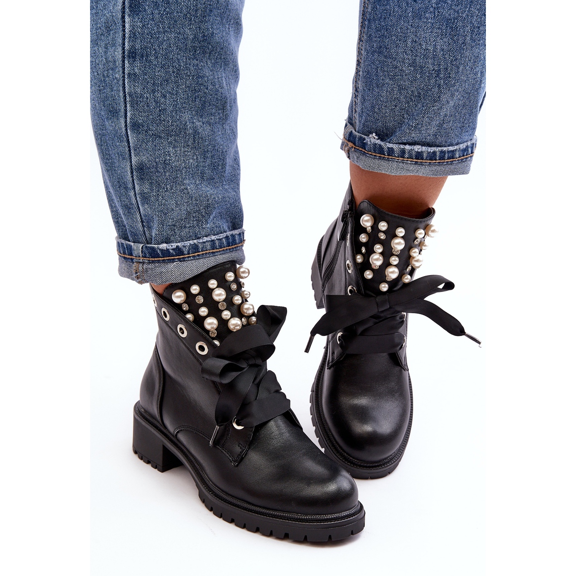 Des bottes pour femmes décorées sur le zip Black Elonte - élégant, confortable et prêt pour des jours plus frais. Fabriqué en cuir écologique de haute qualité, monté sur un talon stable de 4,5 cm de haut, avec une supérieure supérieure (hauteur supérieure 12,5 cm). Le modèle se distingue par des décorations subtiles: strass, strass et arc leur donne une élégance et un caractère féminin. Zippé avec la possibilité de faire correspondre grâce au laçage; L'insertion et la doublure en tissu assurent le confort et l'isolation fait que les chaussures fonctionnent bien en automne / hiver.