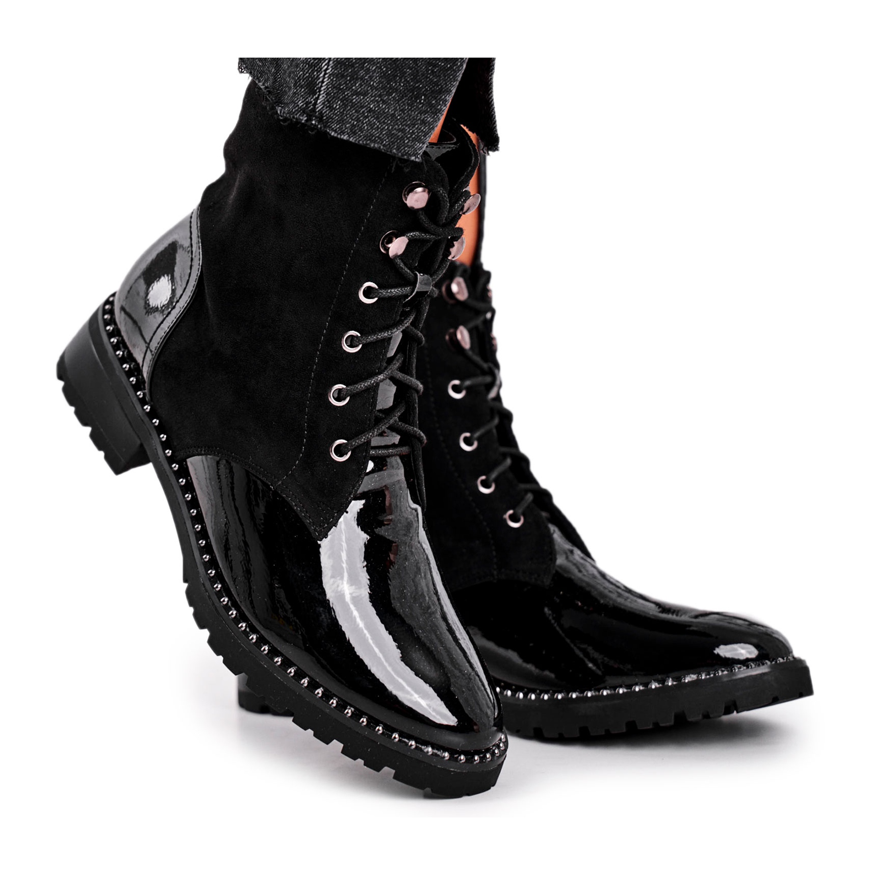 Le style des bottes est classique à lacets et une fermeture éclair supplémentaire sur le côté de la tige facilite l'enfilage et le retrait. La hauteur supérieure de 14,5 cm et un talon plat de 4 cm assurent non seulement le confort, mais aussi la stabilité lors de la marche. Les bottes sont décorées de strass et de clous, ce qui ajoute du caractère et un style unique.