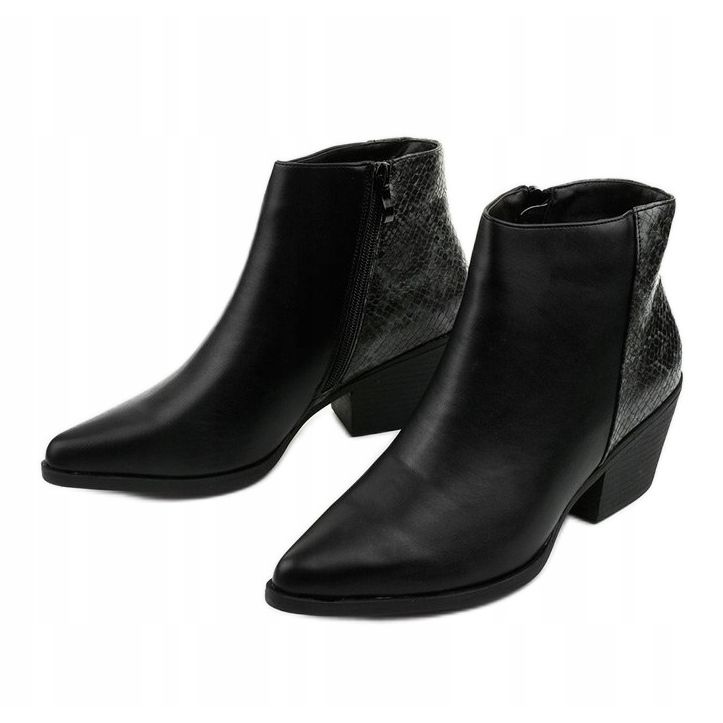 Un avantage particulier de ces bottes est l'insert élégant en cuir écologique, qui imite la peau de serpent, ajoutant un caractère unique aux chaussures. Les santiags noires sont montées sur un délicat talon en forme de cloza, haut de 6 cm, qui permet de les porter confortablement tout au long de la journée. De plus, l’intérieur isolé les rend parfaits pour les journées plus froides.
