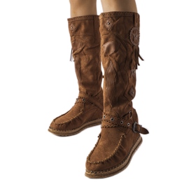 Des bottes féminines élégantes. Un autre Putignano combine une coupe classique avec un personnage boho à la mode. Fabriqué en cuir écologique en daim avec une teinte chaude et au caramel, ils seront un complément efficace aux stylisations d'automne et d'hiver.