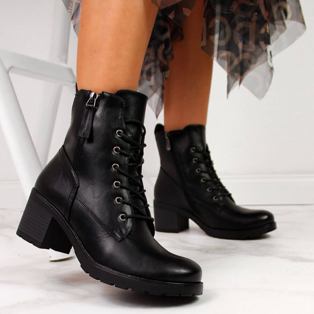 Le modèle Potocki se caractérise par une isolation, ce qui en fait un excellent choix pour les journées les plus froides. Le bout rond et la hauteur cheville ajoutent finesse et légèreté à la silhouette, tandis que le talon bloc (6,5 cm de haut) garantit stabilité et confort de port. De plus, les bottes sont équipées d'une fermeture éclair et d'un laçage, ce qui permet un ajustement parfait au pied.