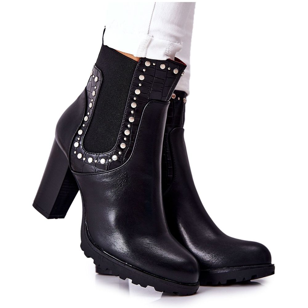 Bottines à talons hauts PG1 avec strass, noir Wissey est une proposition idéale pour les femmes qui apprécient l'élégance et le confort. Ces bottes extrêmement élégantes sont fabriquées en cuir écologique de haute qualité, ce qui garantit durabilité et facilité d'entretien. L'isolation sous forme de couvre-chaussures procure de la chaleur pendant les journées les plus froides, ce qui en fait un excellent choix pour les promenades automnales.