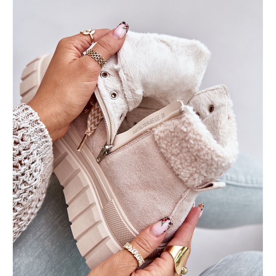 Nous présentons des bottes isolées pour femmes sur la plate-forme dans une couleur beige à la mode de la marque Alcyhen. Ces bottes élégantes sont en daim eco de haute qualité, ce qui les rend à la fois élégantes et respectueuses de l'environnement. Situé sur une plate-forme confortable avec une hauteur de 5 cm, ils vous surdimensionnent parfaitement d'un terrain froid, offrant un confort pendant les jours plus frais.
