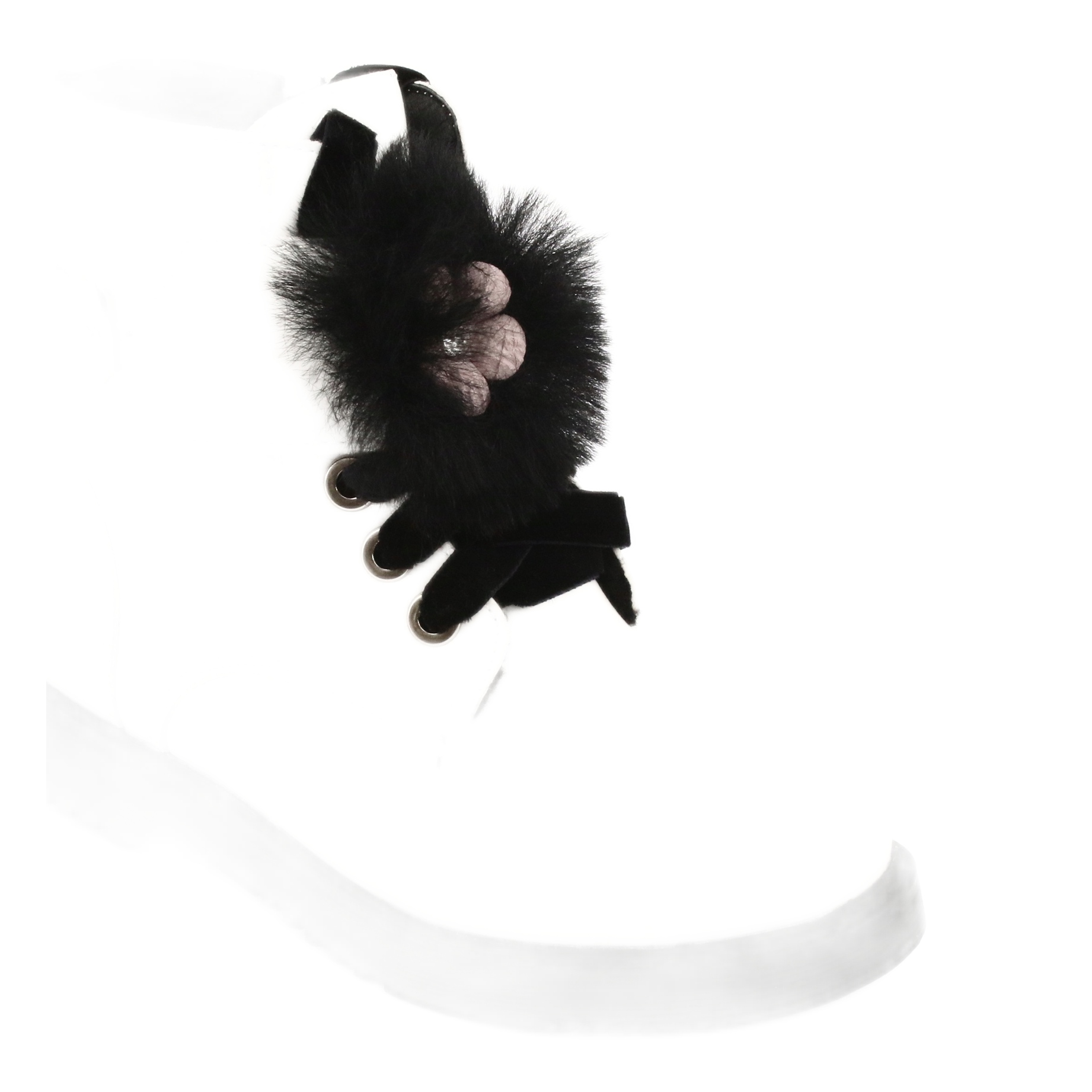 La fourrure noire ajoute une touche de luxe, et une élégante fleur poudrée ornée de paillettes, attachée à la ceinture, donne à l'ensemble un caractère girly. Grâce au système de laçage et à la fermeture éclair intuitive, même les plus jeunes amateurs de mode pourront enfiler ces chaussures élégantes.