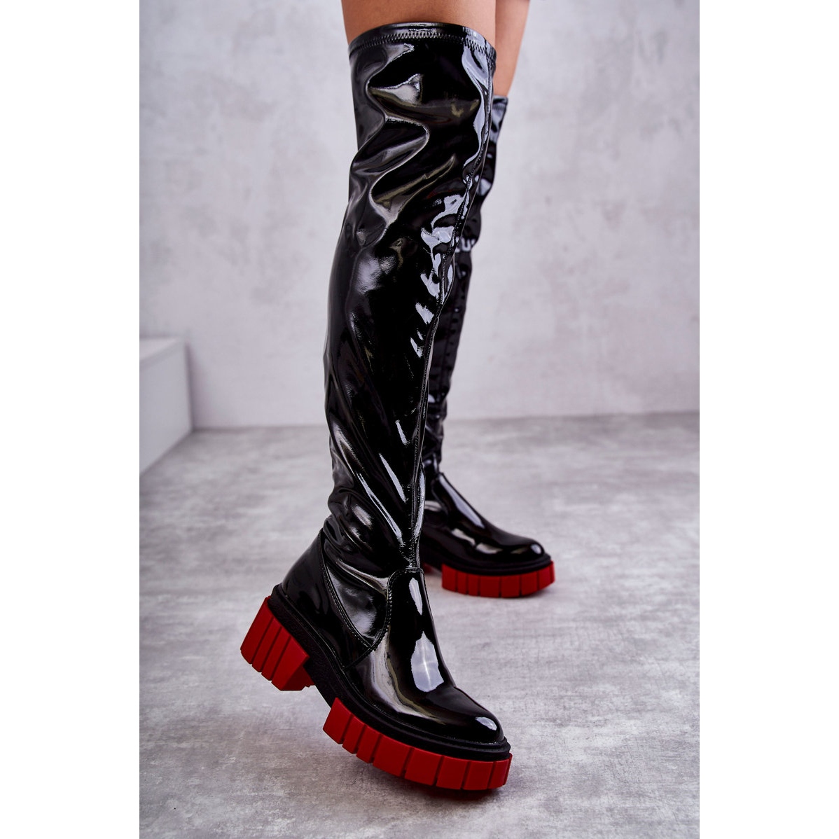 Bottes de travail des femmes peintes - une étape efficace et sûre dans chaque stylisation. Over-le genou en écot-cuir verni, intégré à une semelle massive et plate avec une plate-forme et un talon stable (talon de 6,5 cm, plate-forme 3,5 cm). Zippé sur le côté, avec un talon raidi pour une meilleure stabilité. L'intérieur a un insert isolé (couverture de chaussures) à la hauteur du pied - un confort plus chaud où vous en avez besoin. La semelle rouge caractéristique ajoute un accent de rock et de mode.