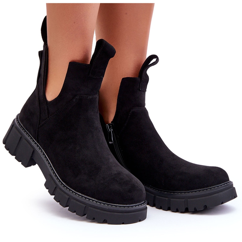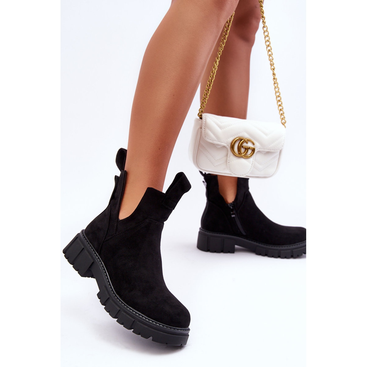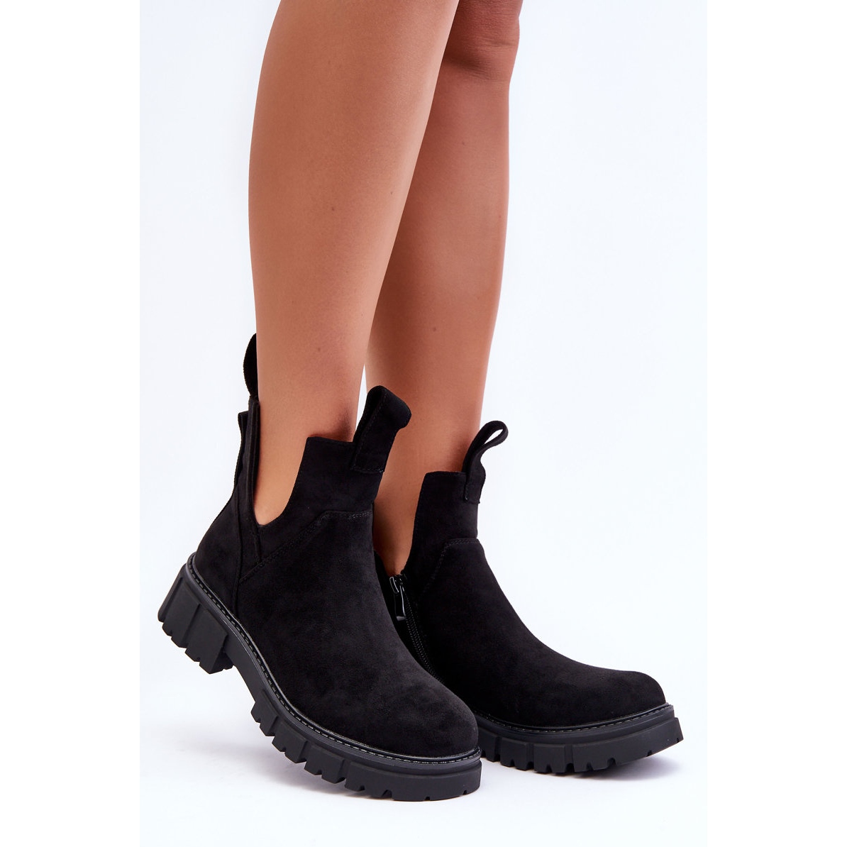 Les bottes modernes, expressives et confortables-ces bottes sont un incontournable dans la garde-robe pour la saison de transition. Fabriqué en daim écologique, avec des découpes à la mode sur les côtés de la tige, montés sur une plate-forme massive et un talon plat et stable. Idéal pour les stylisations de tous les jours et en complément à un look plus audacieux.