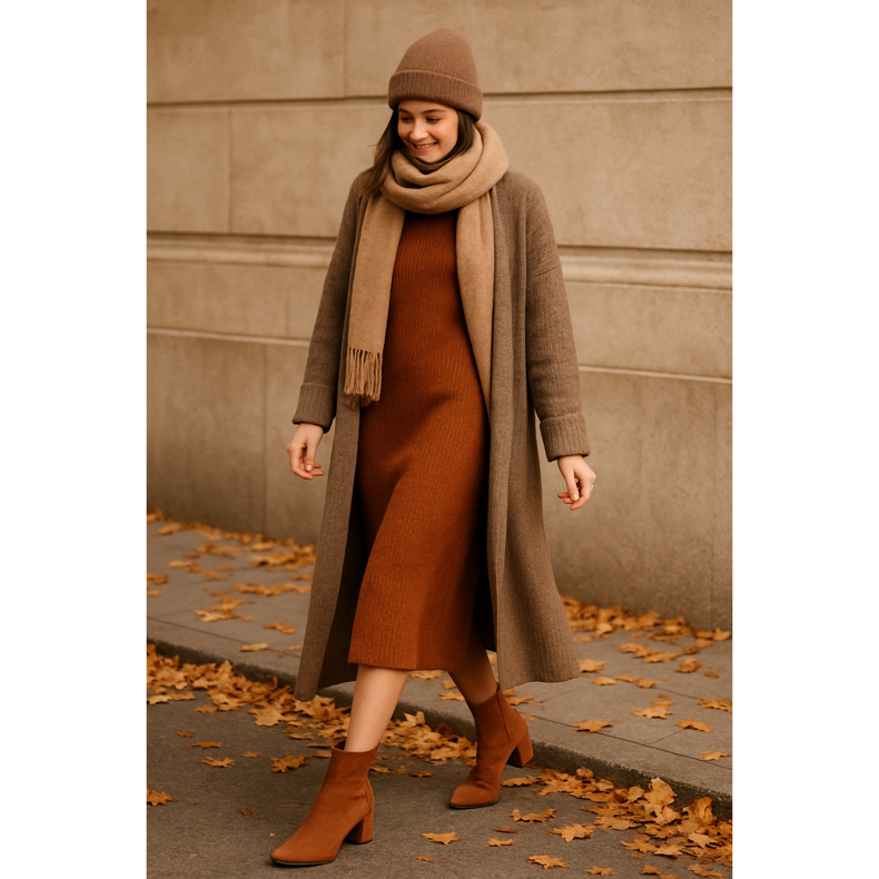 Les robes pull d’automne sont un autre vêtement qui semble phénoménal avec des bottines à bout carré. Choisissez un modèle plus ample dans une nuance de brun gingembre ou de moutarde. Mettez des collants épais de couleur chair ou une teinte assortie à la robe. Ajoutez des bottines plates ou à talons bas. Complétez le look avec un long cardigan et un chapeau de couleur assortie. Cette tenue est non seulement confortable, mais aussi extrêmement élégante et conforme aux tendances de l'automne.