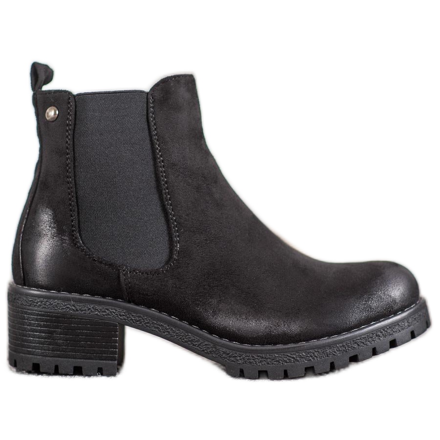 La tige jusqu'à la cheville est soigneusement confectionnée en daim écologique, ce qui ajoute un caractère moderne. Les inserts élastiques en caoutchouc facilitent l'enfilage et l'adaptation au pied, ce qui sera certainement apprécié par toutes les femmes qui apprécient la praticité. Un bout rond et un talon intégré et raidi complètent le look, offrant un maintien adéquat.
