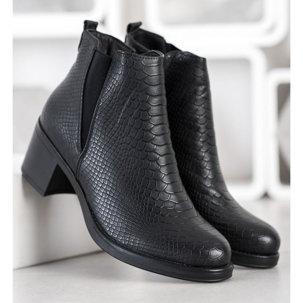 Découvrez les bottines Sweet Shoes noires, tendances et élégantes, qui complèteront parfaitement votre garde-robe automne-hiver. Ces bottines pour femmes uniques se distinguent par une tige en cuir écologique de haute qualité, ornée d'un motif en relief ressemblant à une peau de crocodile.