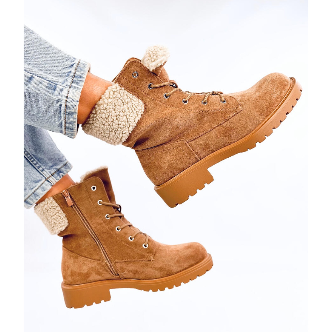Bottines à lacets classiques pour femmes. Ce qui attire le regard, c'est le charmant agneau autour de la tige, qui donne aux chaussures un caractère unique :) Le modèle est traditionnellement lacé, il s'adapte donc parfaitement à la largeur du pied et dispose également d'une fermeture éclair pratique. Ils sont fabriqués en daim écologique et l'intérieur est doublé de fourrure délicate.