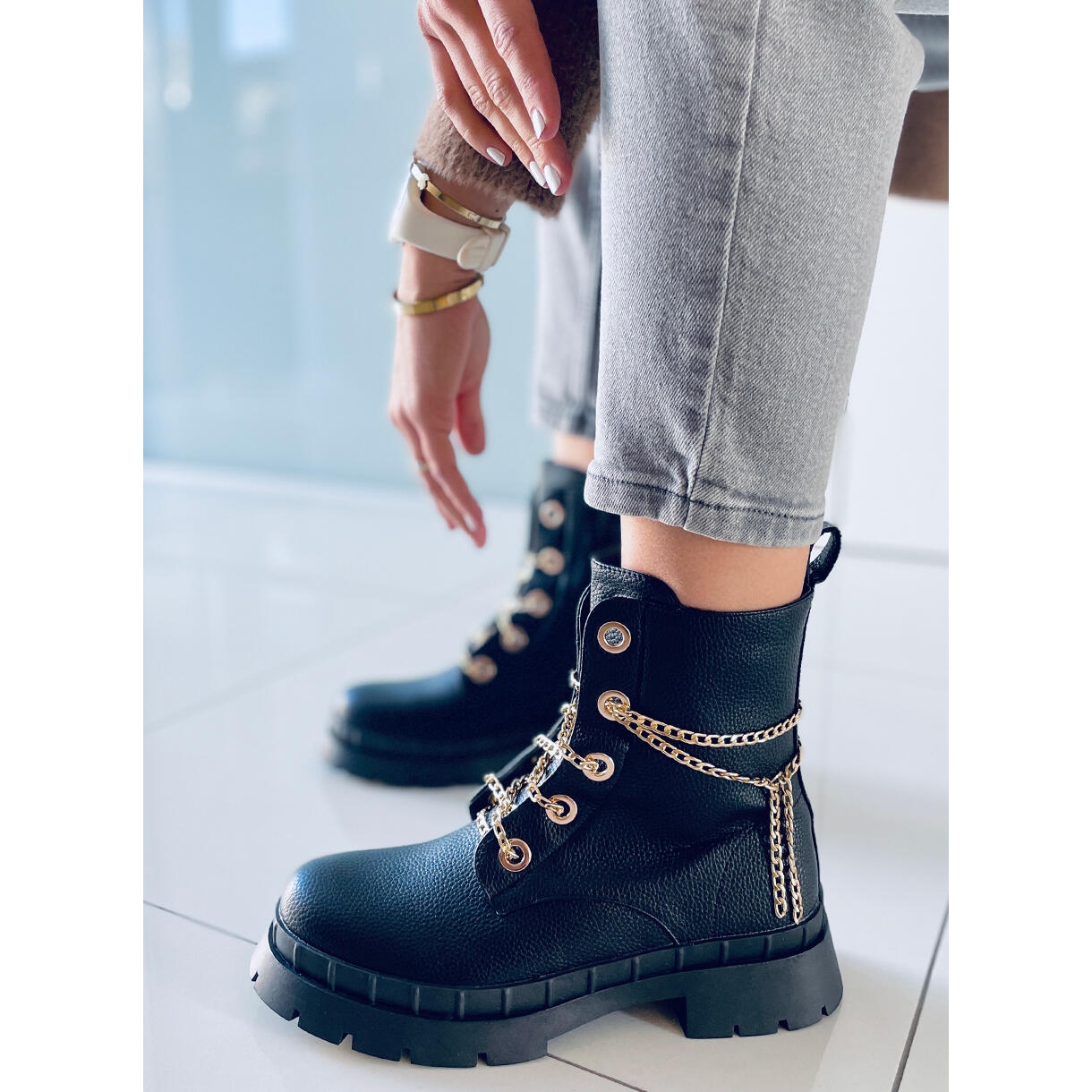 Les bottines à lacets Lohan Black sont un incontournable du dressing féminin ! Ces bottes noires accrocheuses se distinguent par un design original qui allie confort et mode. Au lieu du laçage traditionnel, ce modèle est équipé d'une élégante chaîne en or, qui ajoute un caractère unique. L'ensemble comprend également des lacets remplaçables, ce qui vous permet de personnaliser le look des chaussures.
