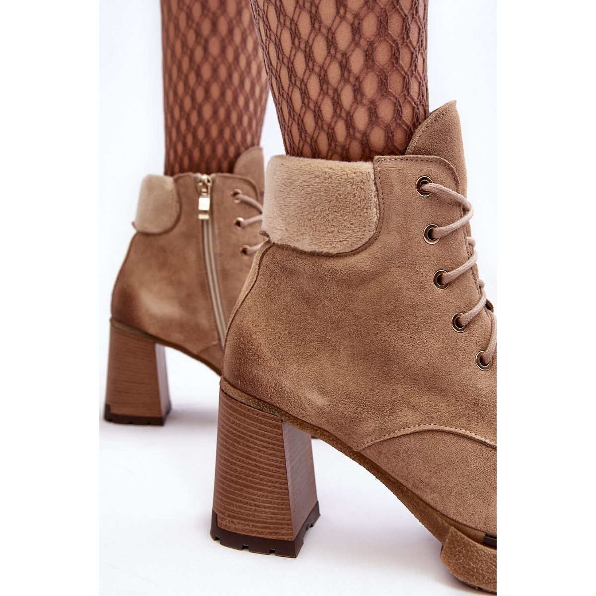 Détails: Bottines à lacets en daim Lemar Flomes beiges sur un talon haut