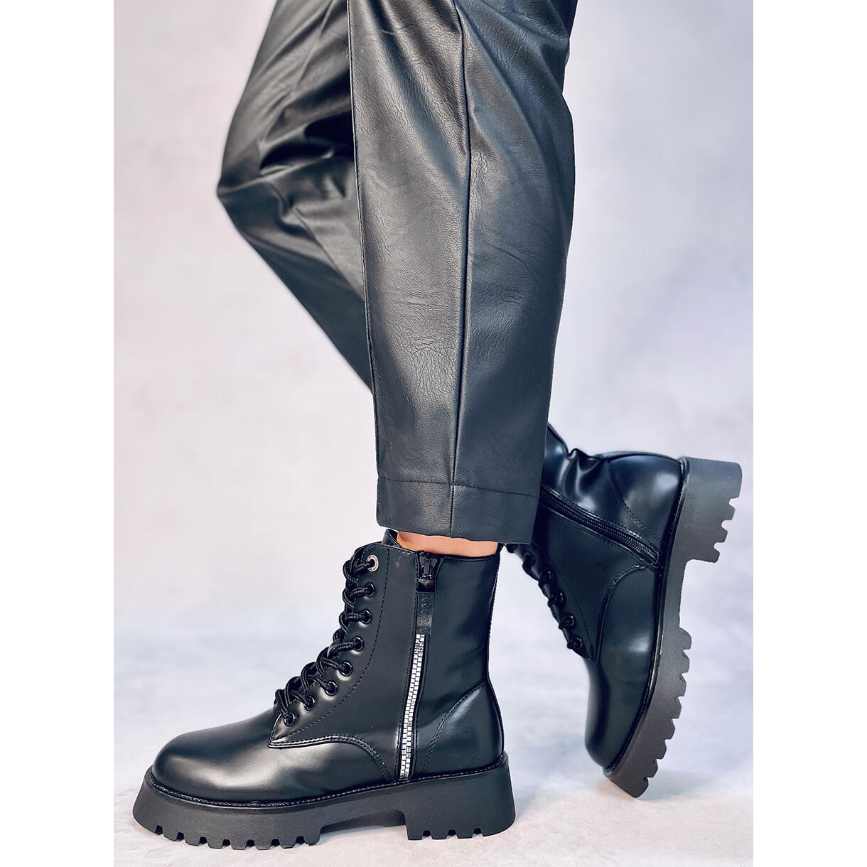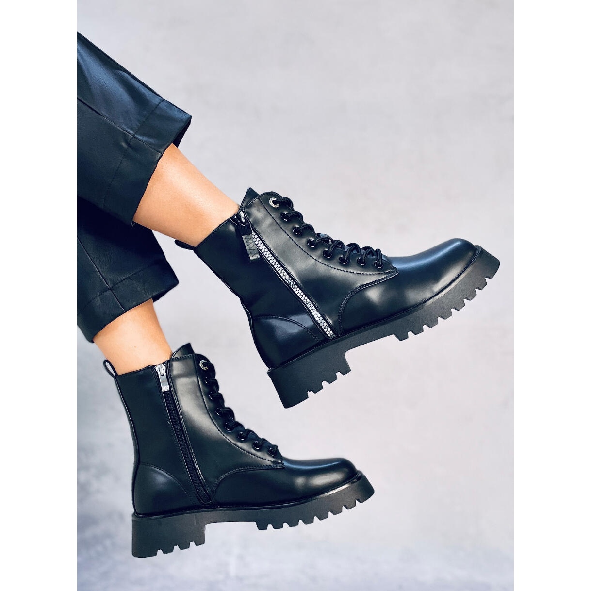 Les bottines Hargest Black en noir sont des chaussures élégantes pour femmes pleine fleur - des travailleuses avec une protection synthétique solide. Ils se caractérisent par un style militariste intemporel, parfait pour un usage quotidien. Ils sont lisses et sans motif distinctif, ce qui les rend universels. Modèle lacé, assurant un ajustement parfait, mais également équipé d'une fermeture éclair pour un enfilage confortable. La haute qualité est remarquable, le matériau extérieur est du cuir écologique. Les chaussures sont isolées - leur intérieur est doublé d'une fourrure délicate, ce qui les rend parfaites pour les journées plus froides. Elles possèdent un bout rond, un talon plat de 4,0 cm de haut et se terminent à la cheville. Les chaussures sont neuves, livrées dans l'emballage d'origine du fabricant. Le produit pèse 1,2 kg et n'a aucune fonction supplémentaire. Le produit fait partie de la collection KeeShoes, identifiée par le code du fabricant BM182794.