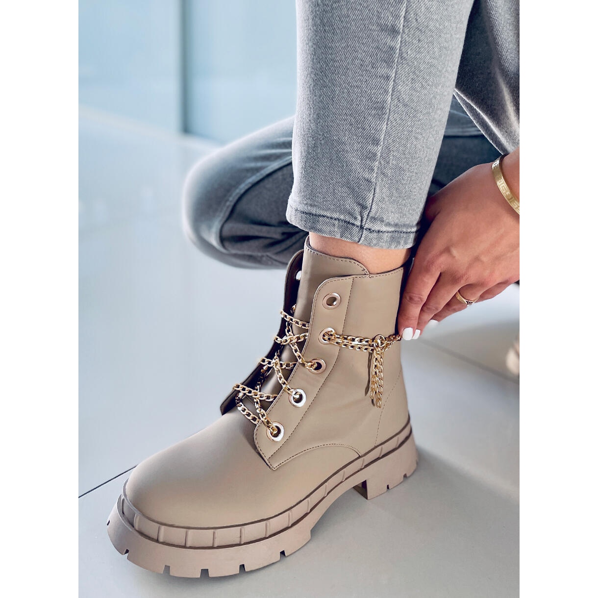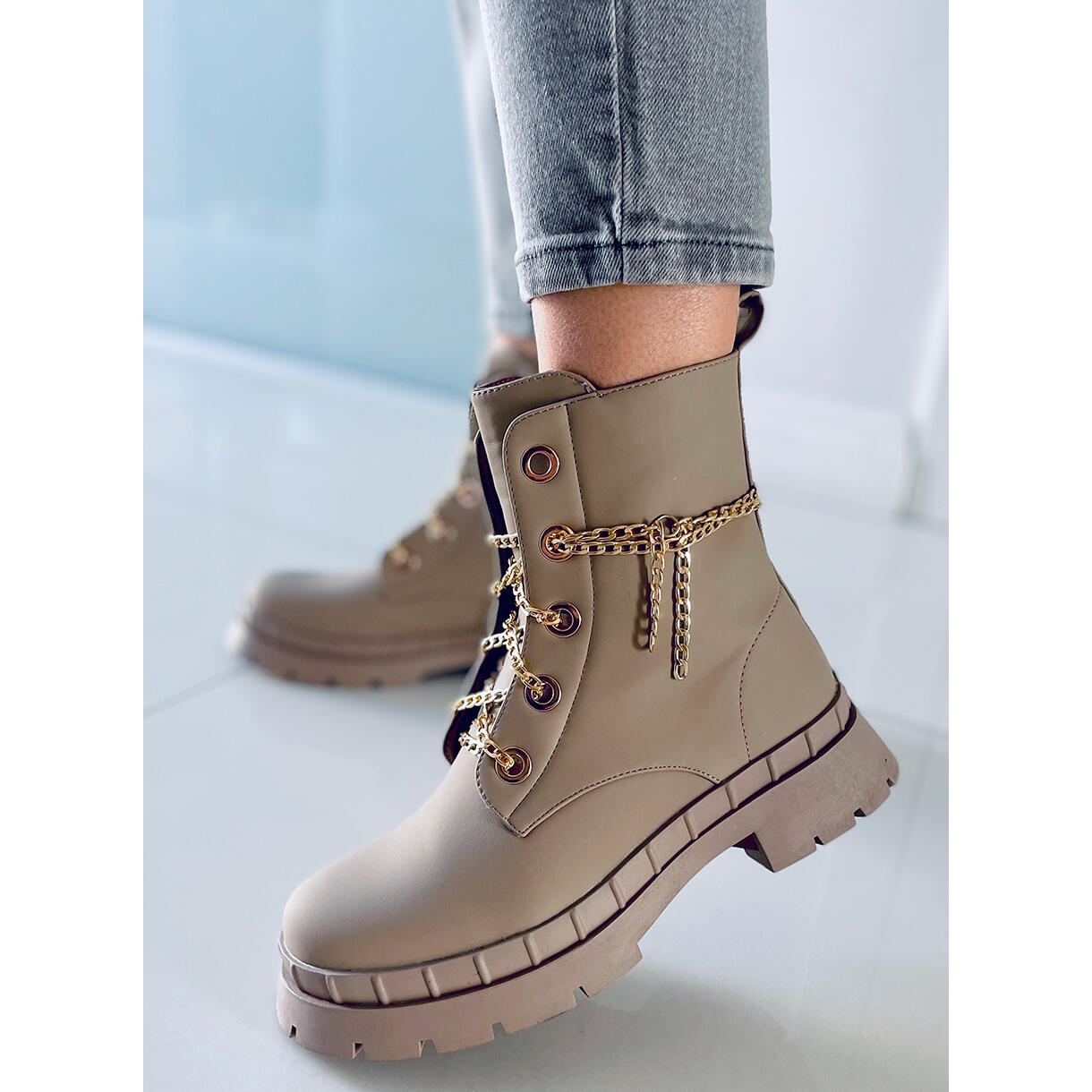 Découvrez un style et un confort uniques avec les bottines à lacets Lohan Apricot dans une nuance de beige. Ces bottines pour femme à semelle épaisse sont un véritable incontournable de toute garde-robe tendance. Leur design unique comporte une chaîne dorée à la place des lacets traditionnels, ce qui leur confère un caractère unique. De plus, le modèle est livré avec des lacets remplaçables, ce qui permet une personnalisation encore plus grande.
