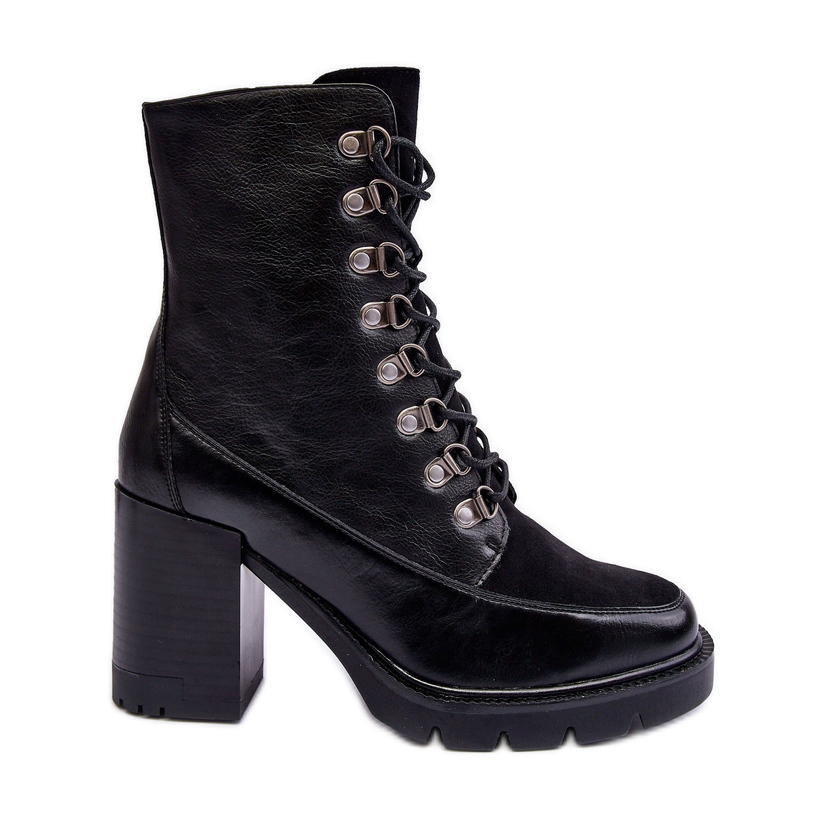 Des bottes élégantes et pratiques idéales pour la saison automne / hiver - ils combinent un talon à la mode et massif avec une plate-forme stable, offrant une certaine étape et un look efficace. Fabriqué d'une combinaison de cuir écologique et d'éco en daim dans une couleur noire classique. Attaché avec une serrure latérale et en outre équipé de laçage pour un meilleur ajustement. L'intérieur isolé avec une couverture de chaussures - chaud et confortable pendant les jours plus frais.