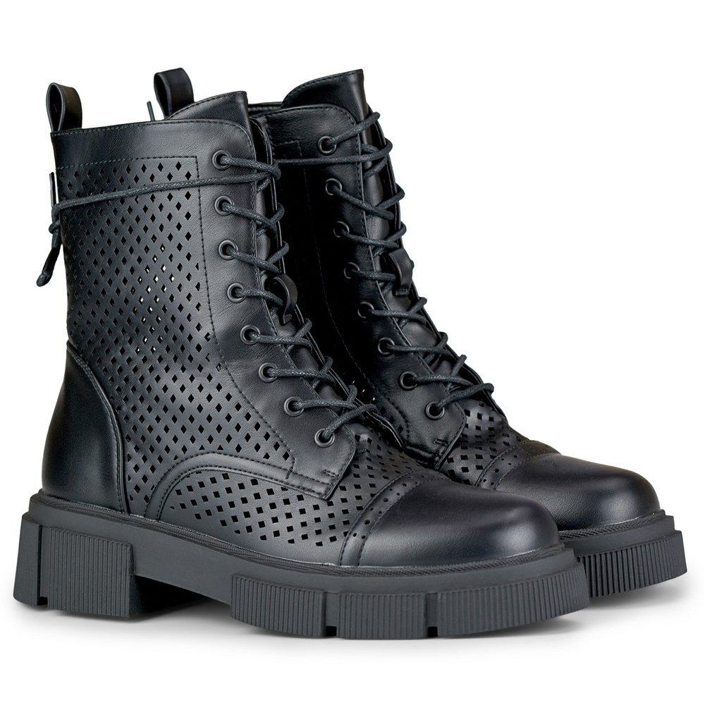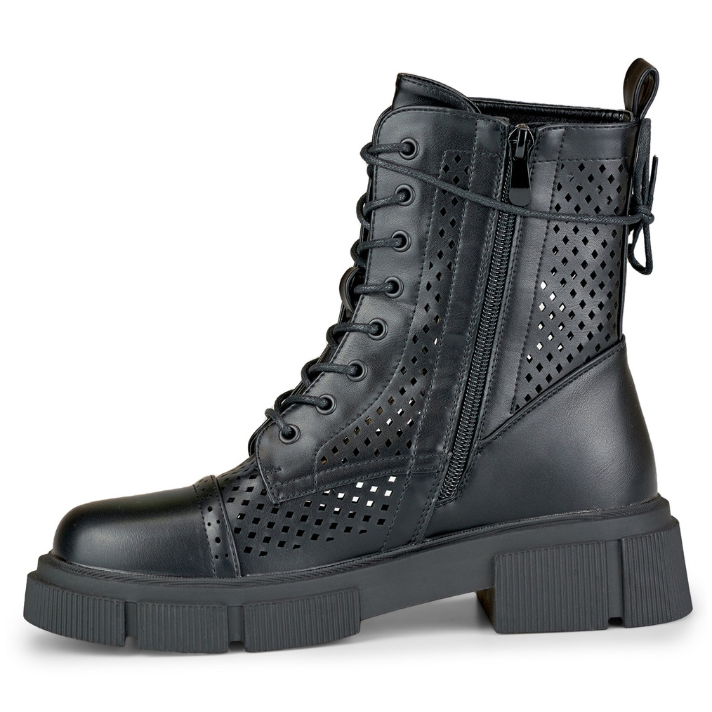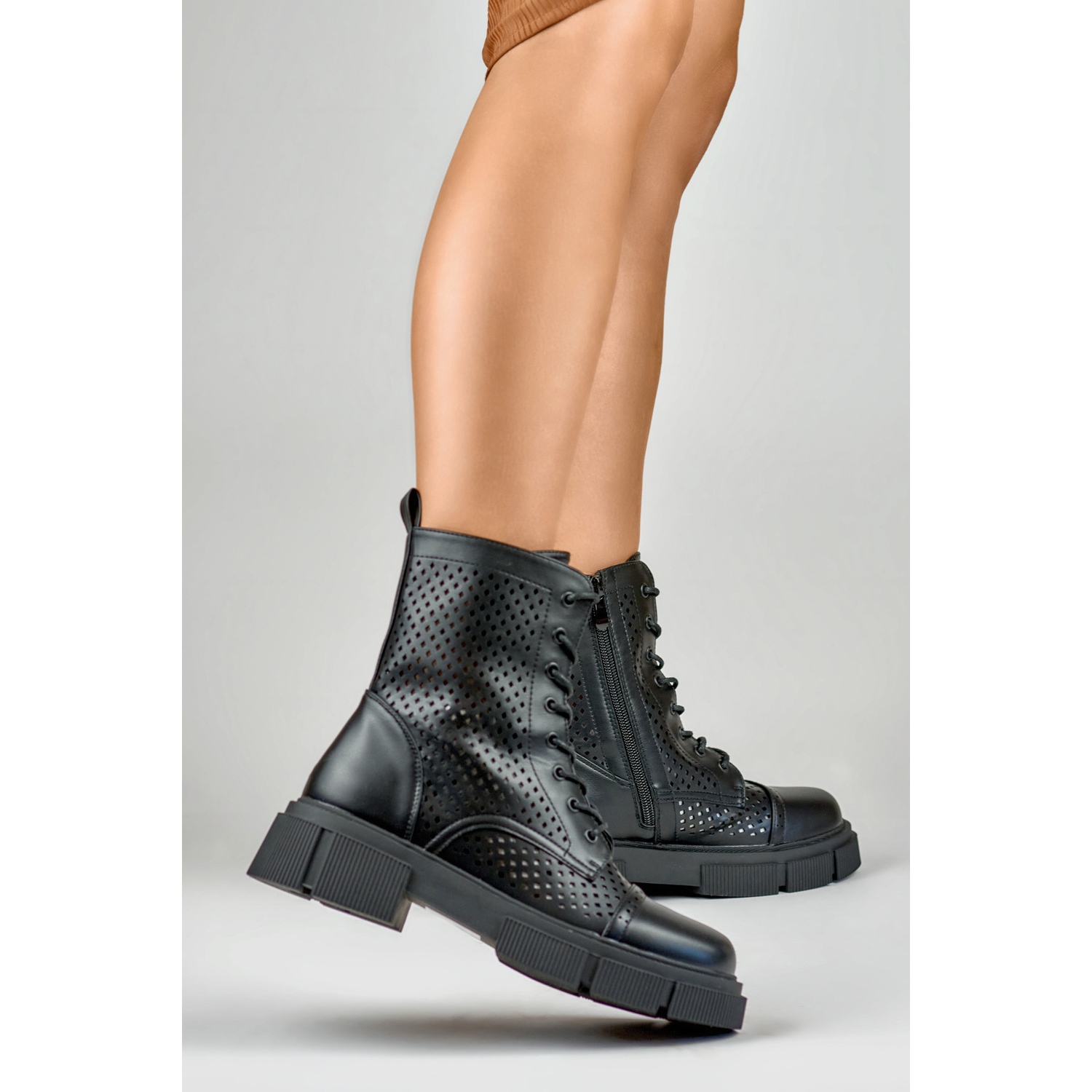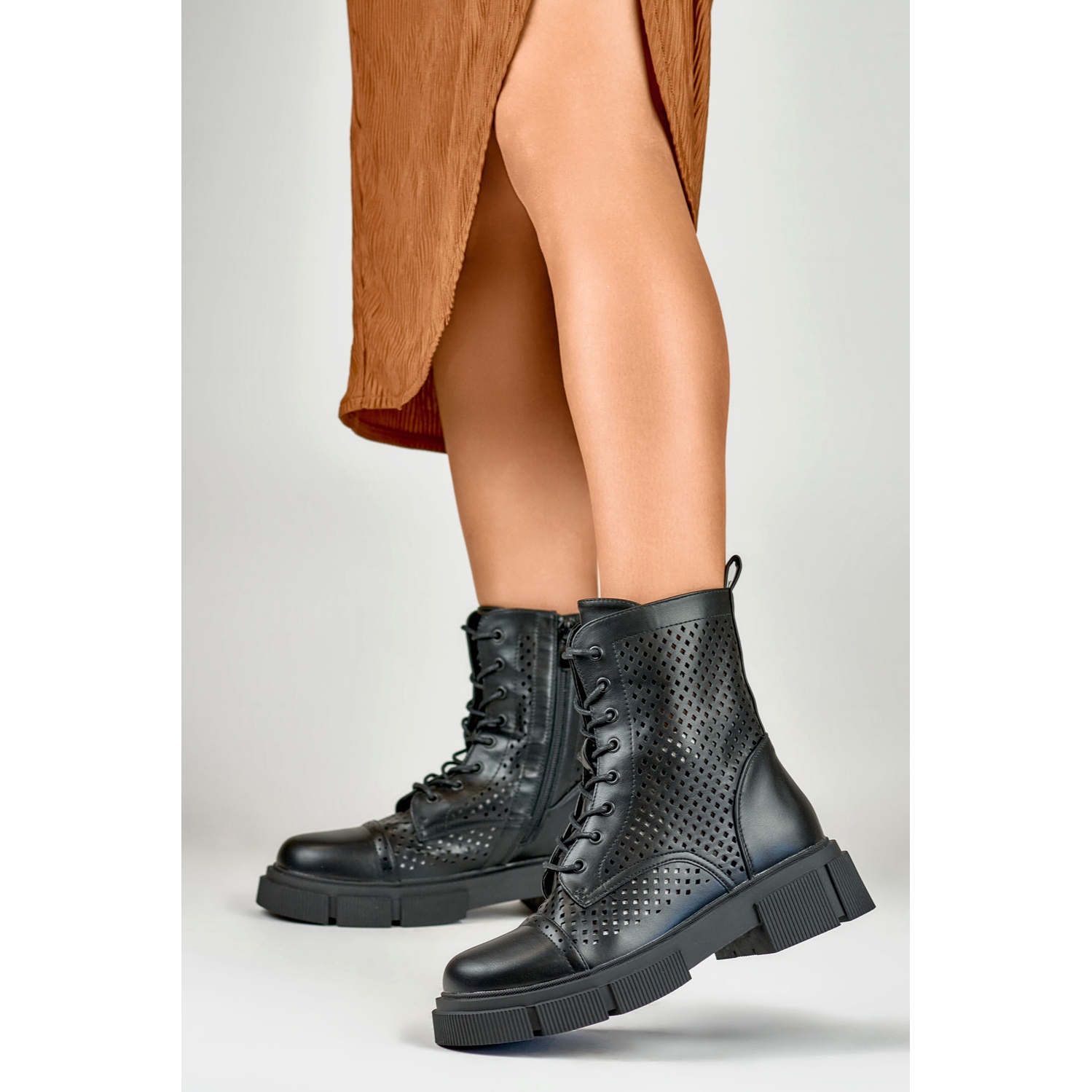 La tige des chaussures est en cuir écologique, assurant un confort d'utilisation. La hauteur de la plateforme est de 4,5 cm, ce qui ajoute grâce et élégance à la silhouette. Les bottes sont équipées de bouts ronds. Ils sont fermés par des lacets et une fermeture éclair, ce qui permet de les ajuster facilement à la largeur de chaque pied.