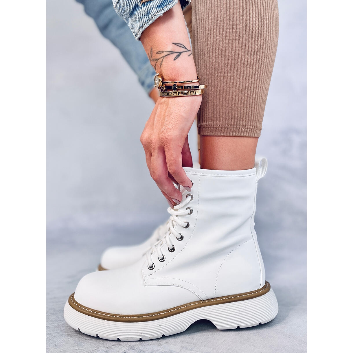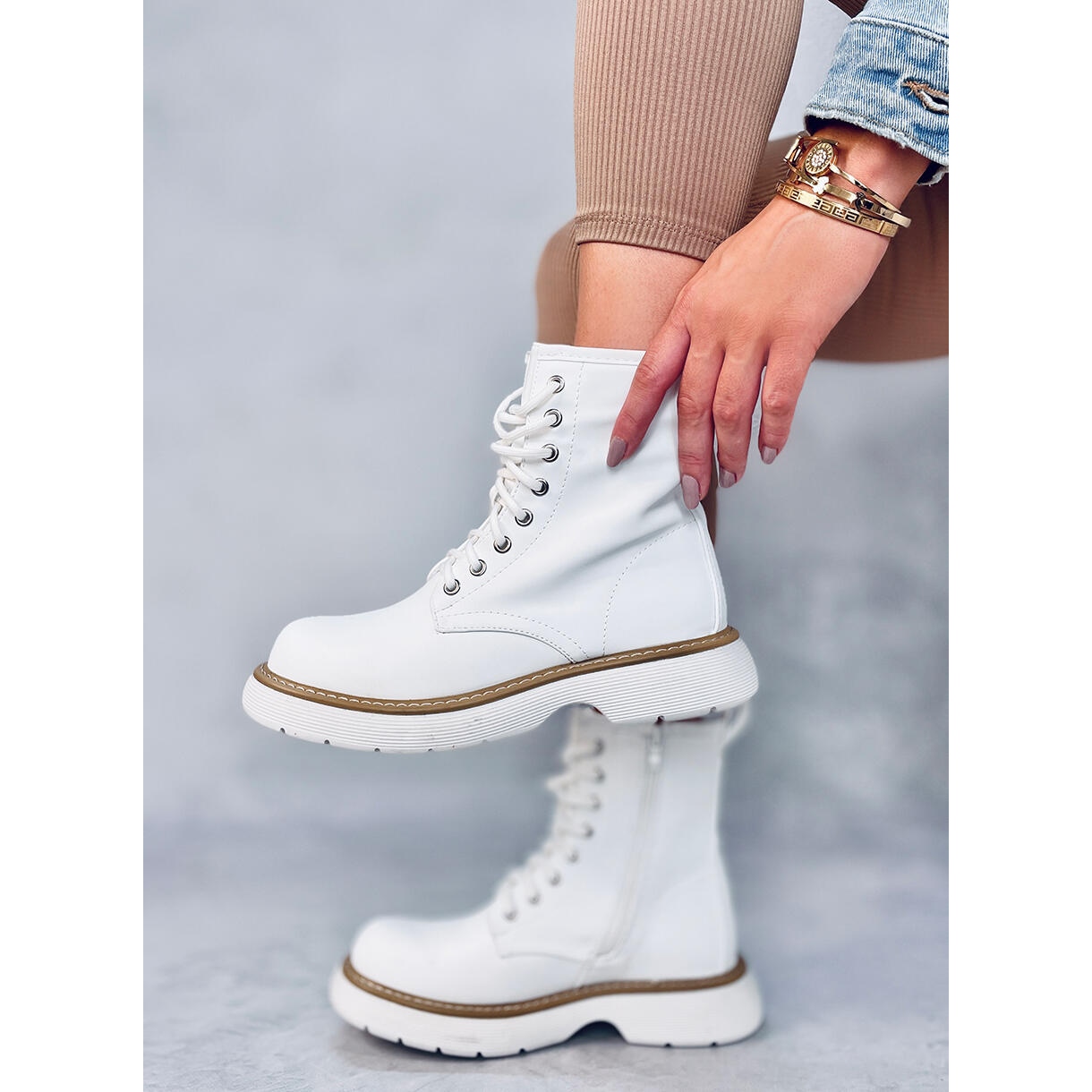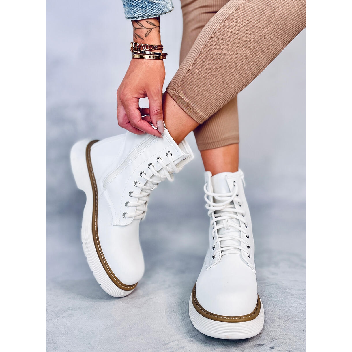 Le produit décrit est des bottines à lacets pour femmes. Ce sont des chaussures de trekking au design iconique sur une semelle épaisse et blanche. Le fabricant les propose en différentes couleurs, la couleur principale étant le blanc avec du beige supplémentaire. Les chaussures sont unies, sans motif particulier.