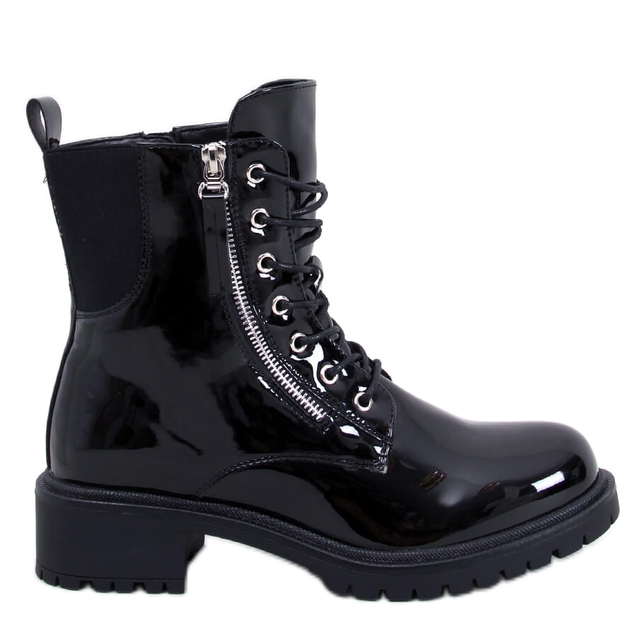 Les bottes noires dendy peintes sont une proposition pour les femmes à la recherche de chaussures courageuses et pratiques. Les travailleurs sur un protecteur en pratiquant le cuir écologique verni, et le château latéral et le laçage classique assurent un ajustement parfait et une mise en place confortable. L'intérieur bordé d'une fourrure délicate garantit un confort thermique les jours plus frais.