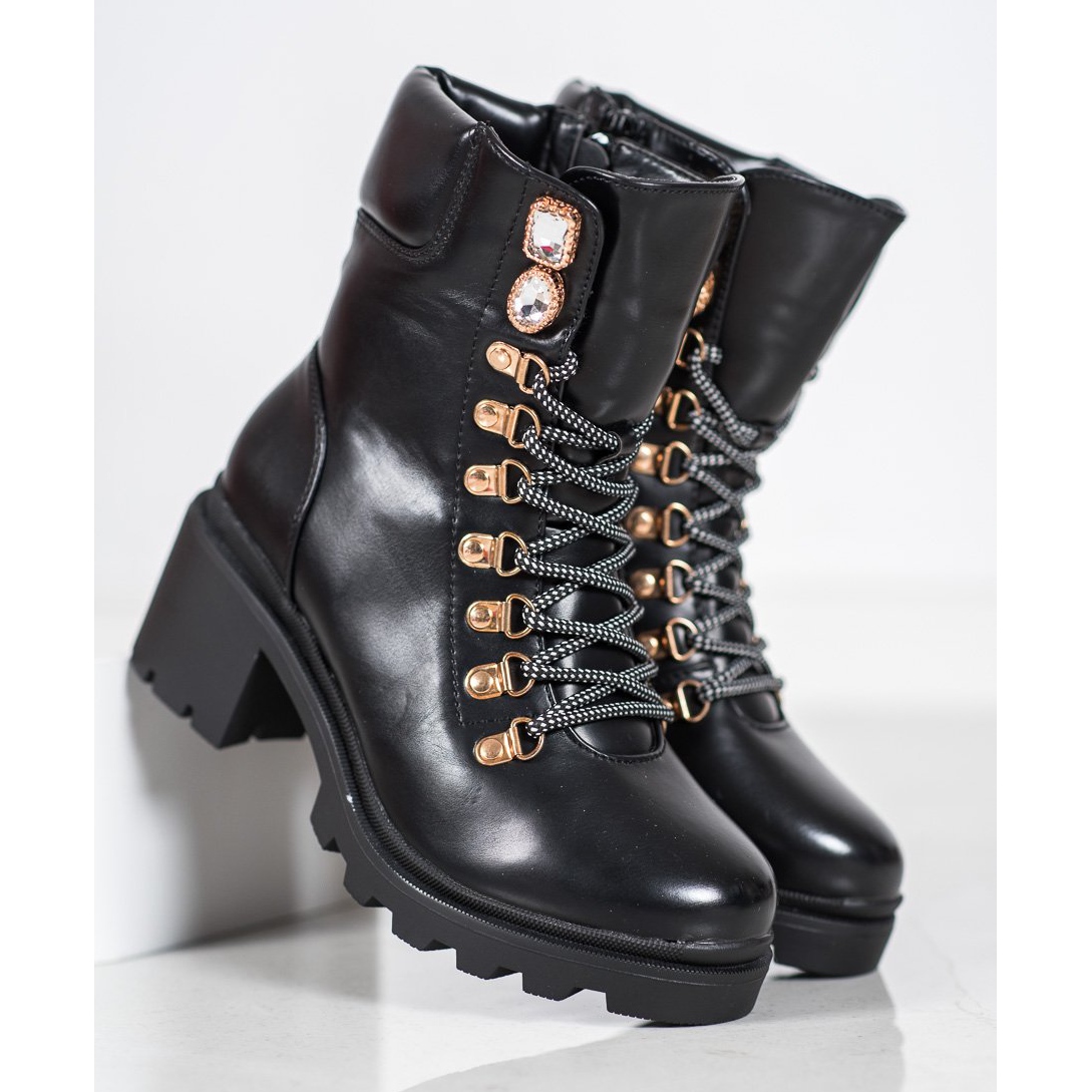 Les bottines Seastar pour femmes sont le choix parfait pour les froides journées d'automne et d'hiver. Fabriqués en cuir écologique de haute qualité, ils se caractérisent par un style extraordinaire et une attention aux détails. Les chaussures noires à lacets séduisent par leur aspect tendance, tandis que les lacets noirs et blancs et les cristaux subtils leur ajoutent originalité et élégance.