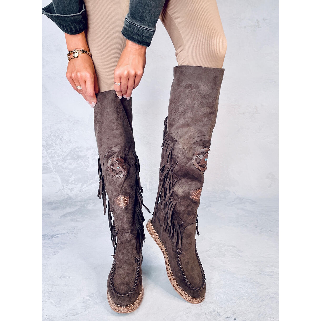 Ces bottes sont issues de la collection KeeShoes, connue pour son souci du détail et sa qualité de fabrication. Décorés de franges et de coutures caractéristiques, ils s'adaptent aux dernières tendances tout en conservant une beauté classique. C'est une proposition idéale pour les femmes qui apprécient le style unique et n'ont pas peur de se démarquer.