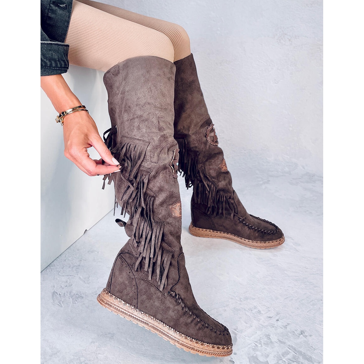 Découvrez la magie des bottes compensées à franges Russo D.KHAKI dans une nuance de marron foncé et ressentez le confort et le style uniques qu'elles offrent. Ces chaussures pour femmes uniques allient élégance et design unique, attirant l'attention de tous ceux qui les voient. Grâce à leur conception originale, basée sur une hauteur de cale pouvant atteindre 9 cm, vous gagnez des centimètres supplémentaires de hauteur et de confiance en vous à chaque pas.