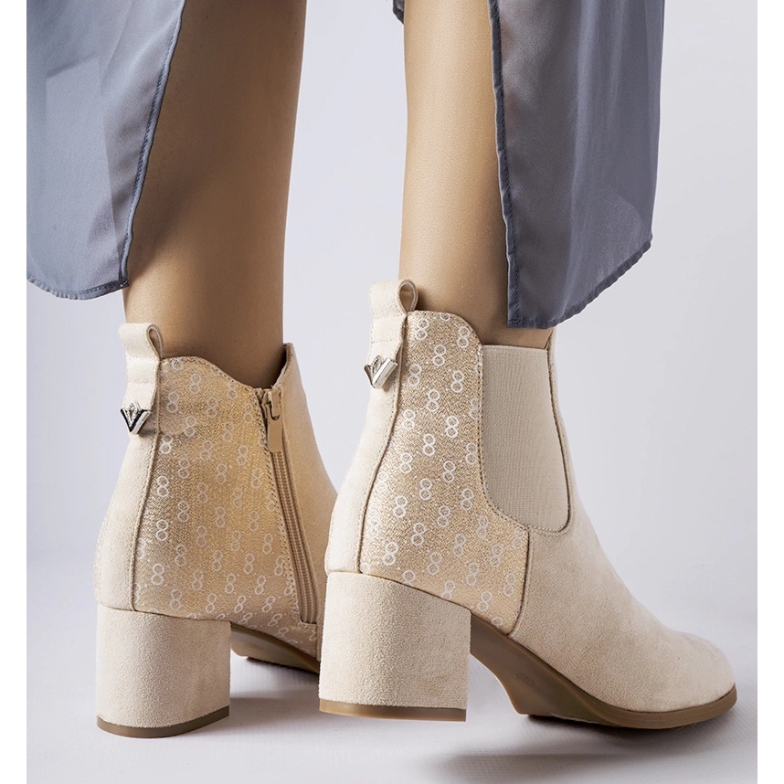Ces bottines beiges à talons bas de Monte sont uniques et modernes, attirant l'attention avec une tige haute qui atteint au-dessus de la cheville. Elles sont confortables grâce à la faible hauteur du talon, qui assure la stabilité lors de la marche. Les bottes sont faciles à enfiler et à enlever grâce à la fermeture éclair.
