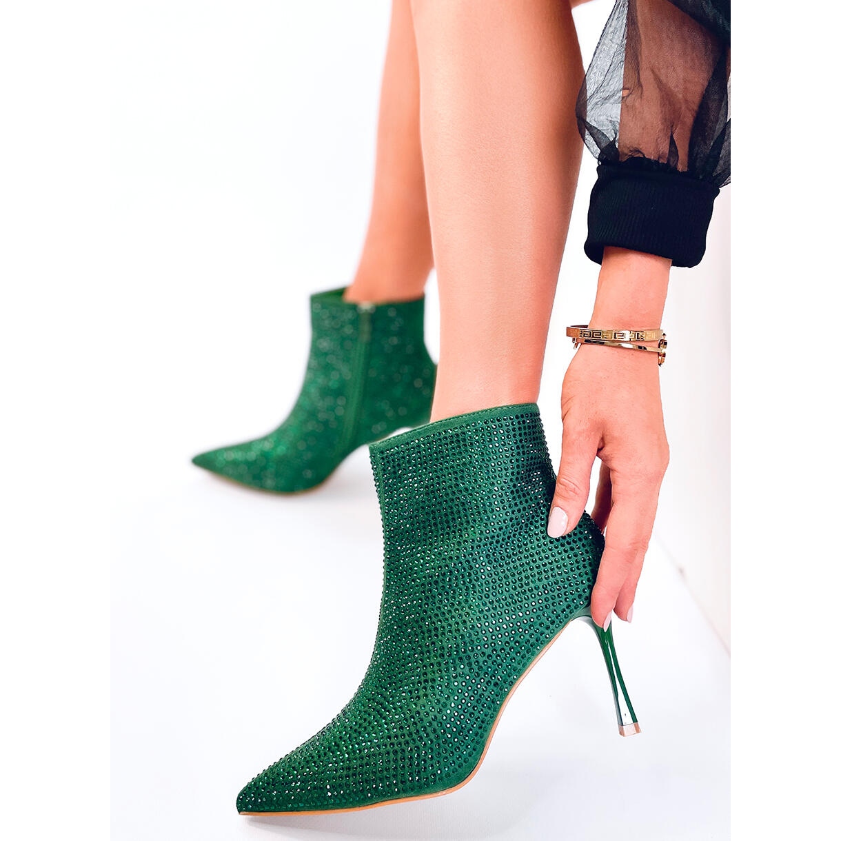 Ces bottines pour femmes sont conçues comme des chaussures élégantes pour femmes et sont classées dans la catégorie des bottines. Elles sont réalisées en daim écologique vert et ont une hauteur de talon de 9 cm. De plus, ils sont décorés de pierres qui ajoutent élégance et brillance.