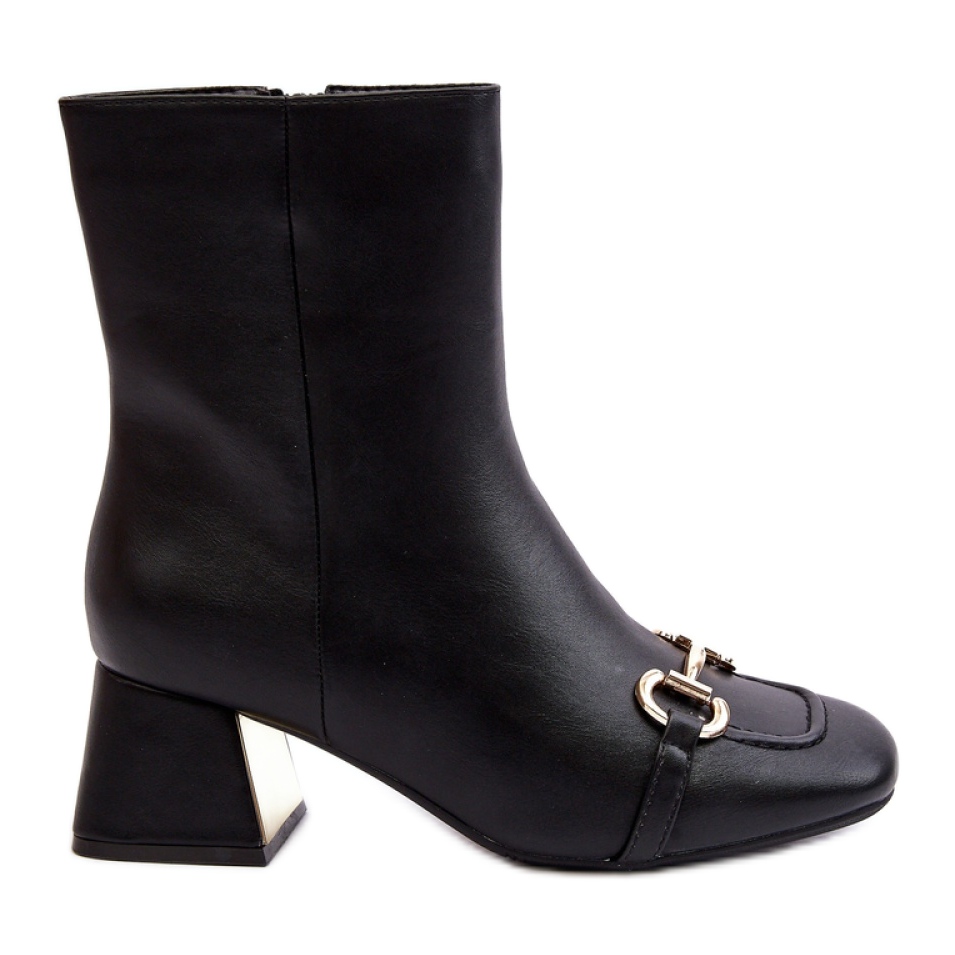 Les bottes noires ne sont pas seulement un ajout à la mode, mais aussi des chaussures pratiques. Fixé avec un curseur de côté, facilitez la mise en place et le décollage. Ils se distinguent par un orteil carré, ce qui leur donne la modernité. Le talon raidis assure la stabilité et le confort du port. De plus, un ornement élégant en couleur en plastique doré introduit un accent subtil qui attirera l'attention de tout le monde.