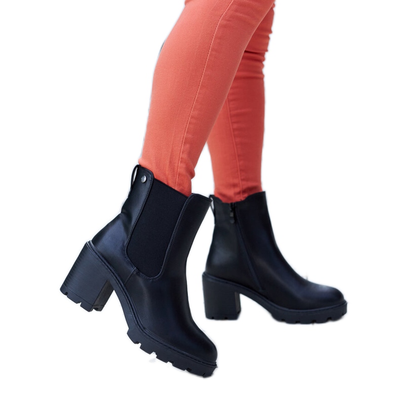 Les bottes de Caio noires sont un modèle féminin isolé sur un post stable, combinant une coupe classique avec des matériaux modernes. Fabriqué en cuir biologique (PU noir) avec un insert de tissu chaud, ils fonctionneront comme des chaussures élégantes et pratiques pour la saison d'automne.