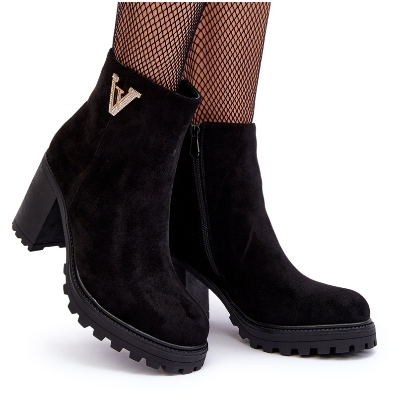 Détails: Bottines à talons hauts en daim pour femmes avec décoration, noir fort le noir