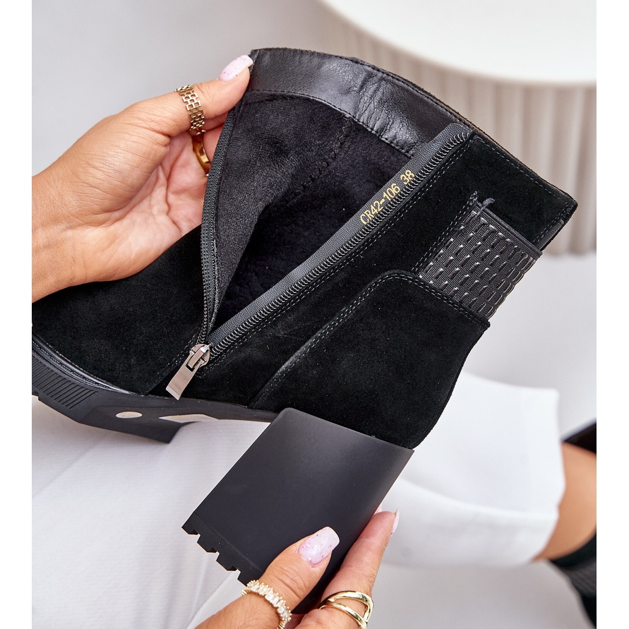 Les bottines isolées en daim S.Barski D&A CR42-106 en noir sont un choix parfait pour les femmes qui apprécient l'élégance et le confort. Fabriqués en daim naturel, ils sont parfaits pour les journées froides, offrant non seulement du style mais aussi de la fonctionnalité. Un talon stable de 9 cm en forme de bloc assure le confort à chaque pas, et l'isolation avec un couvre-chaussure garde vos pieds au chaud même pendant les jours les plus froids.