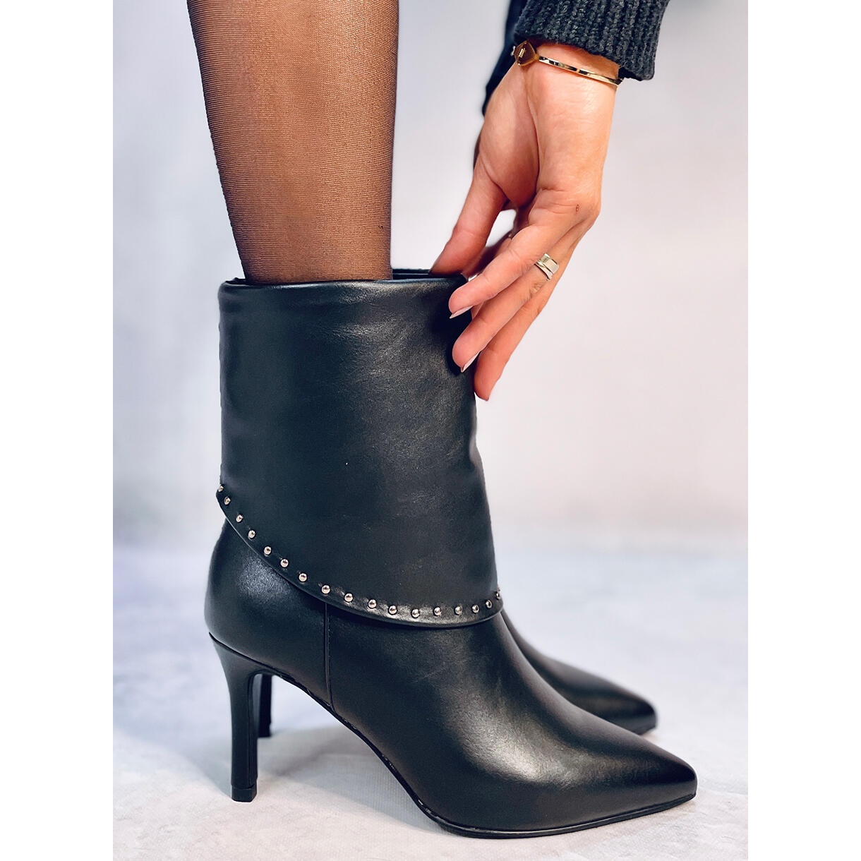 Le design de ces charmantes bottes s'inspire des tendances actuelles, combinant une silhouette élancée avec une pointe subtile et un détail original sous la forme d'une tige roulée ornée de clous accrocheurs. Leur couleur noire universelle offre de nombreuses possibilités pour créer des styles variés, des plus décontractés aux plus sophistiqués.