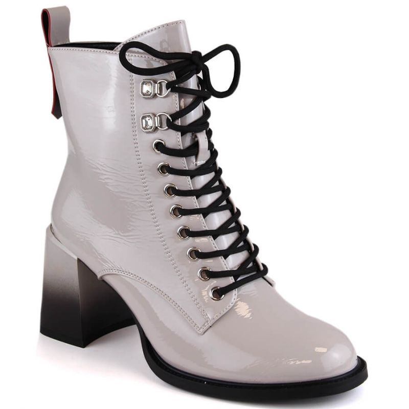 Des bottes élégantes et pratiques qui combinent l'élégance des femmes et le confort chaque jour. La tige en cuir écologique verni leur donne un caractère élégant, et la "couverture" de doublure isolée offre un confort les jours plus frais. Un talon stable de 8 cm met l'accent sur la figure, et la fixation sur une fermeture éclair et des lacets permet un ajustement parfait.