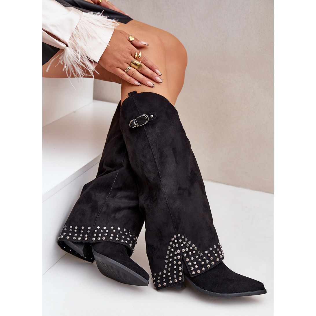 Les bottes avec une tige cassée sur le poteau noir sont des bottes féminines élégantes et élégantes, qui s'intègrent parfaitement dans les dernières tendances de la mode. Fabriqués en daim eco de haute qualité, ils combinent le confort de porter avec un sournois de mode. Leur collaboration de la tige, décorée de strass et une pince élégante, attire l'œil et donne aux chaussures un caractère unique.
