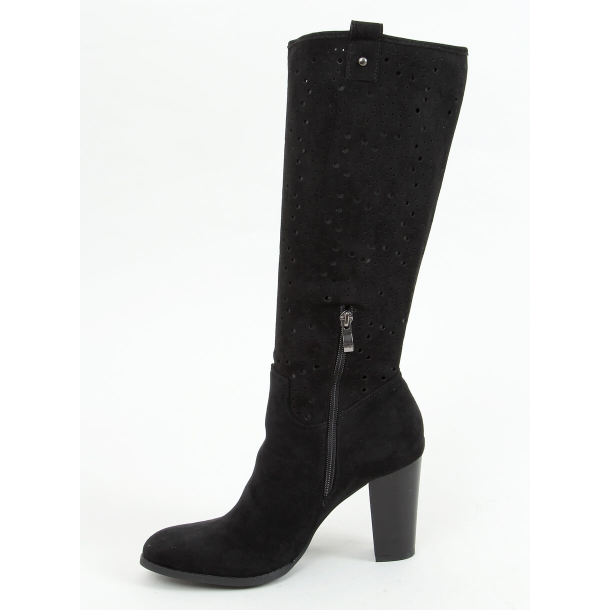 RT89956 Les bottes noires à talons hauts ajourées sont un choix idéal pour les femmes qui apprécient à la fois le style et le confort. Fabriquées en daim écologique de haute qualité, ces bottines pour femme séduisent par leur subtil motif ajouré, qui leur confère un caractère unique. Le mât stable de 9 cm de haut offre l'équilibre parfait entre élégance et confort, ce qui en fait un excellent choix pour un usage quotidien.