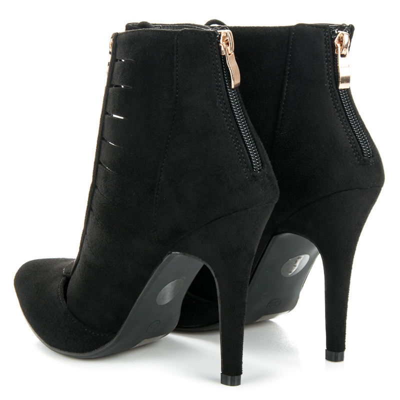 Ajoutez une touche d'élégance et de sensualité à votre garde-robe avec les bottines à talons hauts ajourées de Cm Paris. Ces bottines noires, confectionnées en cuir suédé écologique de haute qualité, sont une combinaison parfaite de style et de confort. Leur bout en amande ajoute de la subtilité et leur hauteur cheville les permet de s'associer aussi bien avec des robes qu'avec des pantalons.