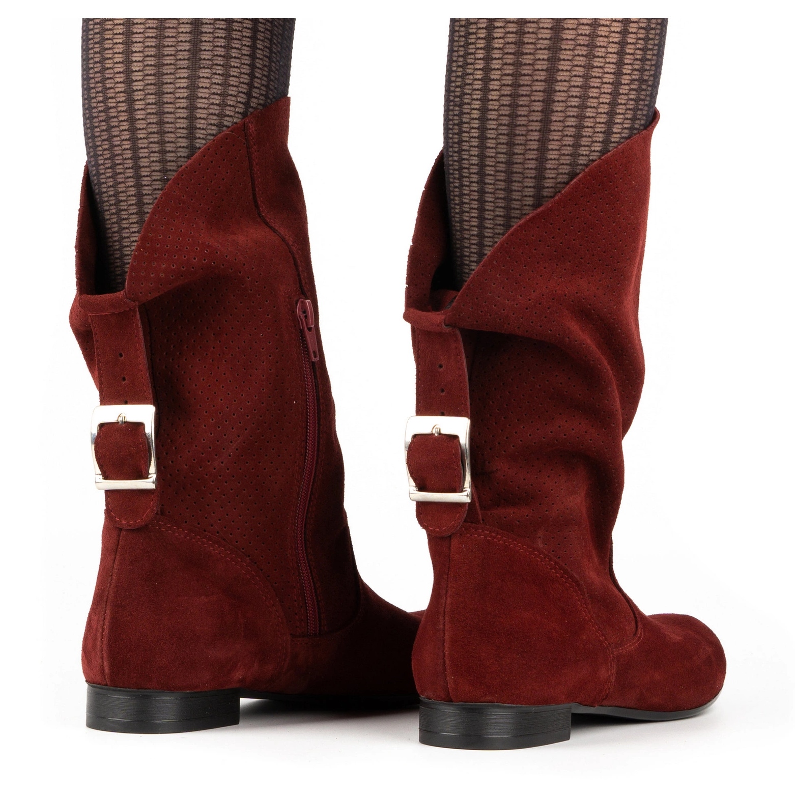 Le produit décrit est des bottes ajourées d'Olivier, modèle Elena, bordeaux. Les chaussures pour femmes sont fabriquées en cuir nubuck naturel de haute qualité, ont une semelle intérieure en cuir souple et sont universelles : elles s'adaptent aussi bien aux robes qu'aux pantalons. Grâce à des trous délicats et aérés (ajourés), ils assurent une circulation d'air adéquate, empêchant les pieds de transpirer et évitant les cors.