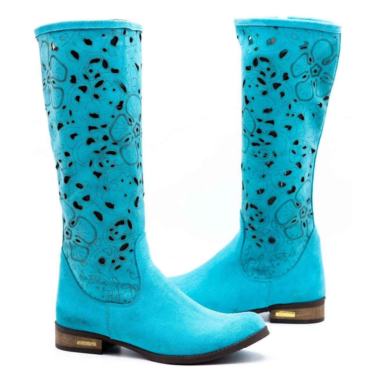 Les bottines ajourées turquoise pour femme Olivier sont un choix parfait pour toute femme à la mode qui souhaite allier confort et élégance. Fabriquées en cuir naturel (nubuck), ces bottes sont extrêmement douces et agréables au toucher, ce qui les rend exceptionnellement confortables à porter. Grâce aux propriétés flexibles de la matière, ils s'adaptent parfaitement à la forme des jambes, ce qui souligne leur caractère féminin.