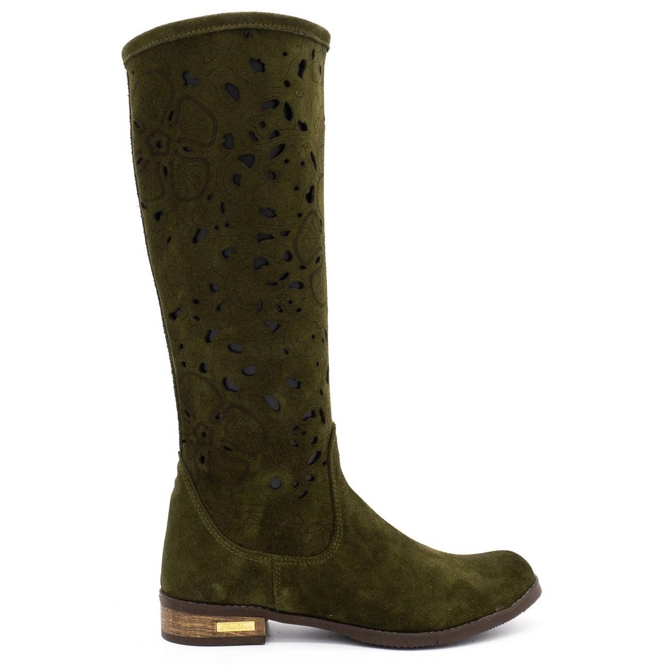 Bottes féminines élégantes et confortables Olivier en cuir naturel (nubuk) - doux, agréable au toucher et facilement adaptant à la jambe. Le motif ouverte, géométrique-floral sur la tige leur donne un personnage frais et mangeur de printemps, et la longueur universelle du genou les fait correspondre à de nombreux styles.
