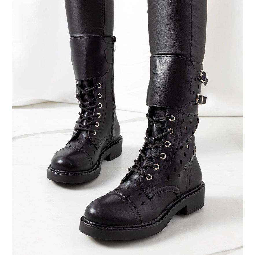 Les bottines noires ajourées sont le choix idéal pour les femmes qui recherchent des chaussures à la mode et confortables pour diverses occasions. Ce modèle associe une coupe caractéristique façon bovver, ornée d'un délicat motif ajouré, qui lui confère un charme unique. Fabriquées en cuir écologique de haute qualité, les bottes assurent durabilité et confort de port.