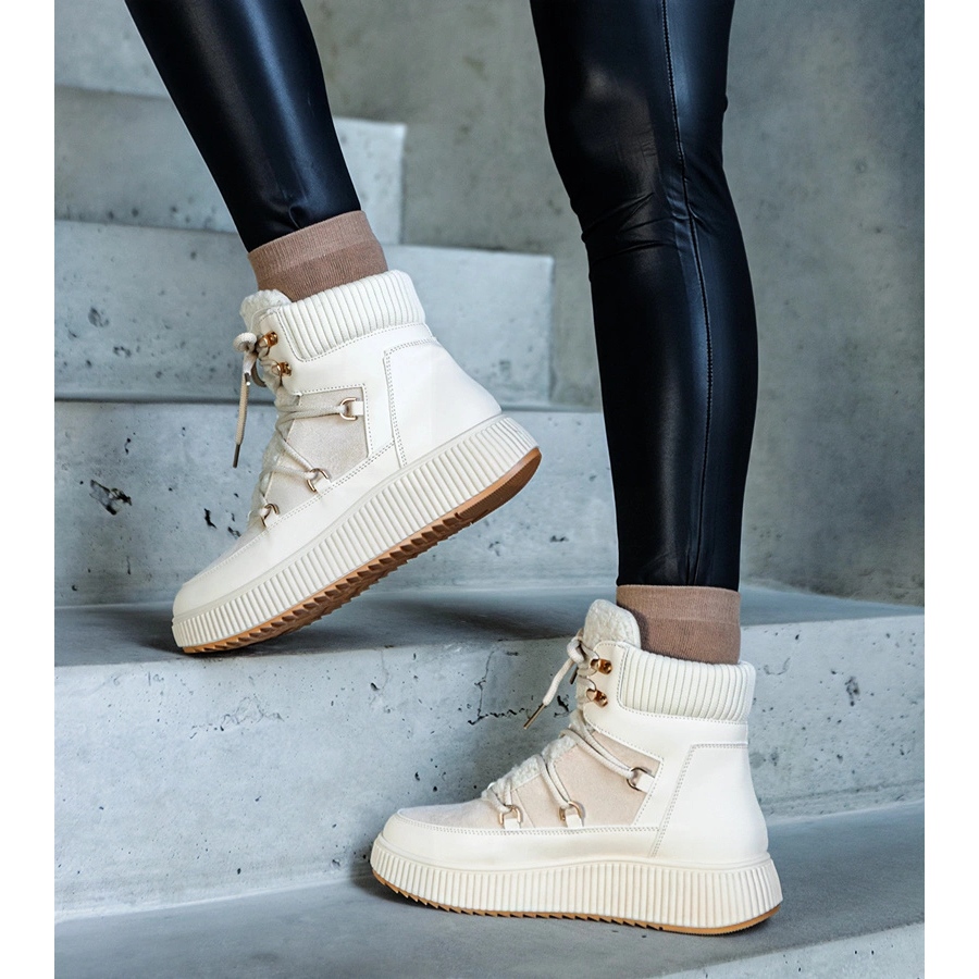 Leur intérieur et leur plate-forme isolés offrent une excellente protection contre le froid, ce qui en fait une solution idéale pour les jours d'hiver. Le talon moyen et le fermoir à lacs permettent un ajustement parfait au pied, ce qui garantit le confort de porter toute la journée. La semelle en caoutchouc assure non seulement la stabilité sur diverses surfaces, mais ajoute également un caractère quelque peu sportif.